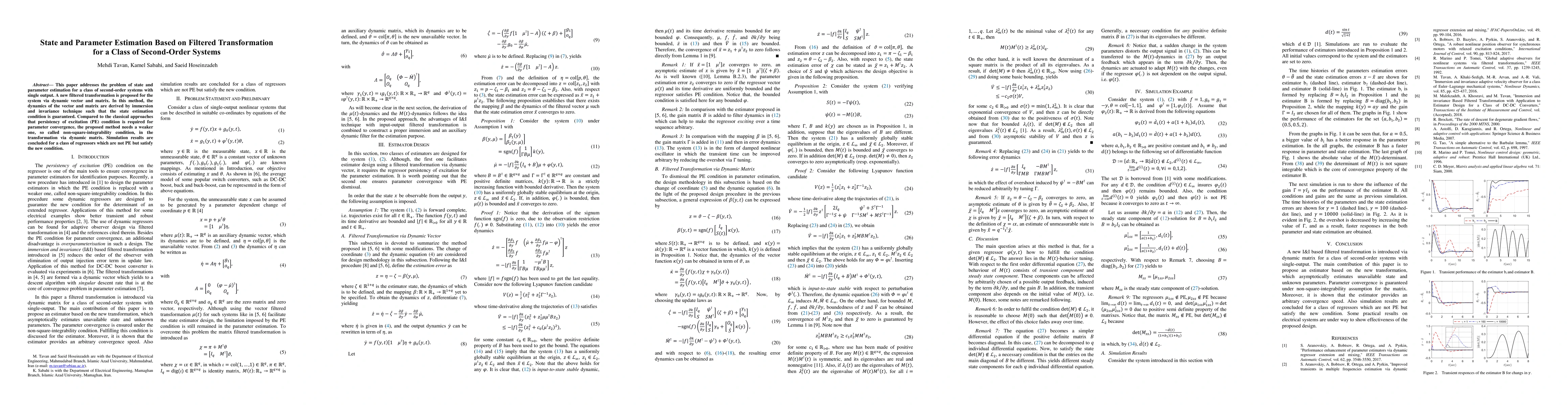 This paper addresses the problem of state and parameter estimation for a class of second-order systems with single output. A new filtered transformation is proposed for the system via dynamic vector and matrix. In this method, the dynamics of the vector and matrix are derived by immersion and invariance technique such that the state estimation condition is guaranteed. Compared to the classical approaches that persistency of excitation (PE) condition is required for parameter convergence, the proposed method needs a weaker one, so called non-square-integrability condition, in the transformation via dynamic matrix. Simulation results are concluded for a class of regressors which are not PE but satisfy the new condition.