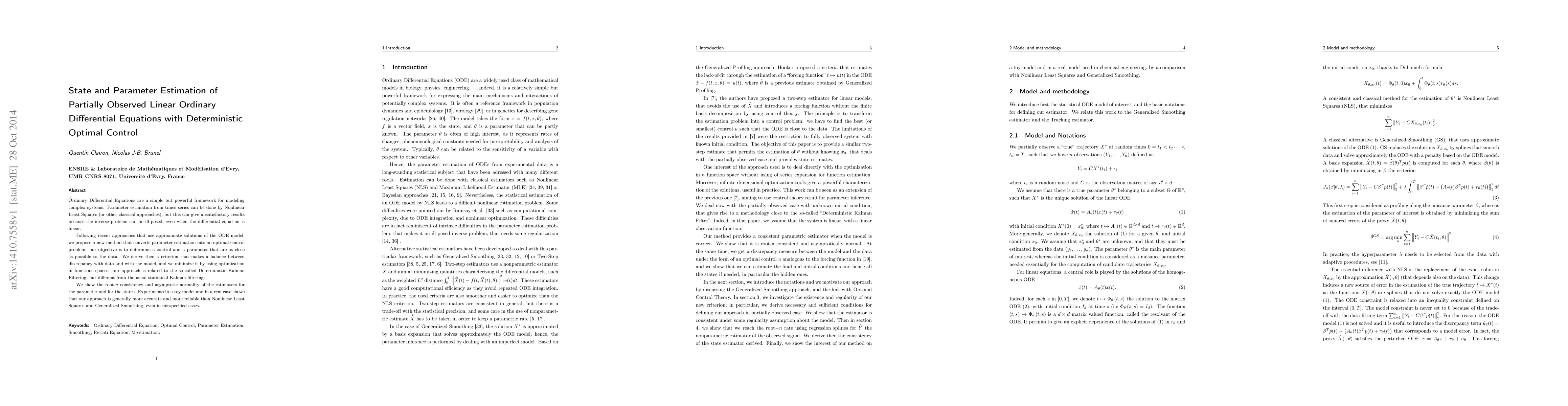 Ordinary Differential Equations are a simple but powerful framework for modeling complex systems. Parameter estimation from times series can be done by Nonlinear Least Squares (or other classical approaches), but this can give unsatisfactory results because the inverse problem can be ill-posed, even when the differential equation is linear. Following recent approaches that use approximate solutions of the ODE model, we propose a new method that converts parameter estimation into an optimal control problem: our objective is to determine a control and a parameter that are as close as possible to the data. We derive then a criterion that makes a balance between discrepancy with data and with the model, and we minimize it by using optimization in functions spaces: our approach is related to the so-called Deterministic Kalman Filtering, but different from the usual statistical Kalman filtering. e show the root-$n$ consistency and asymptotic normality of the estimators for the parameter and for the states. Experiments in a toy model and in a real case shows that our approach is generally more accurate and more reliable than Nonlinear Least Squares and Generalized Smoothing, even in misspecified cases.