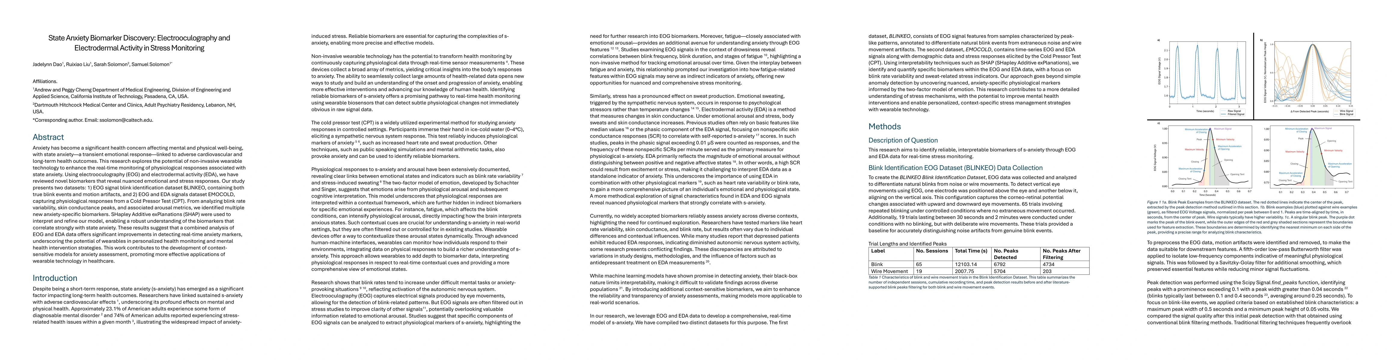Anxiety has become a significant health concern affecting mental and physical well-being, with state anxiety, a transient emotional response, linked to adverse cardiovascular and long-term health outcomes. This research explores the potential of non-invasive wearable technology to enhance the real-time monitoring of physiological responses associated with state anxiety. Using electrooculography (EOG) and electrodermal activity (EDA), we have reviewed novel biomarkers that reveal nuanced emotional and stress responses. Our study presents two datasets: 1) EOG signal blink identification dataset BLINKEO, containing both true blink events and motion artifacts, and 2) EOG and EDA signals dataset EMOCOLD, capturing physiological responses from a Cold Pressor Test (CPT). From analyzing blink rate variability, skin conductance peaks, and associated arousal metrics, we identified multiple new anxiety-specific biomarkers. SHapley Additive exPlanations (SHAP) were used to interpret and refine our model, enabling a robust understanding of the biomarkers that correlate strongly with state anxiety. These results suggest that a combined analysis of EOG and EDA data offers significant improvements in detecting real-time anxiety markers, underscoring the potential of wearables in personalized health monitoring and mental health intervention strategies. This work contributes to the development of context-sensitive models for anxiety assessment, promoting more effective applications of wearable technology in healthcare.