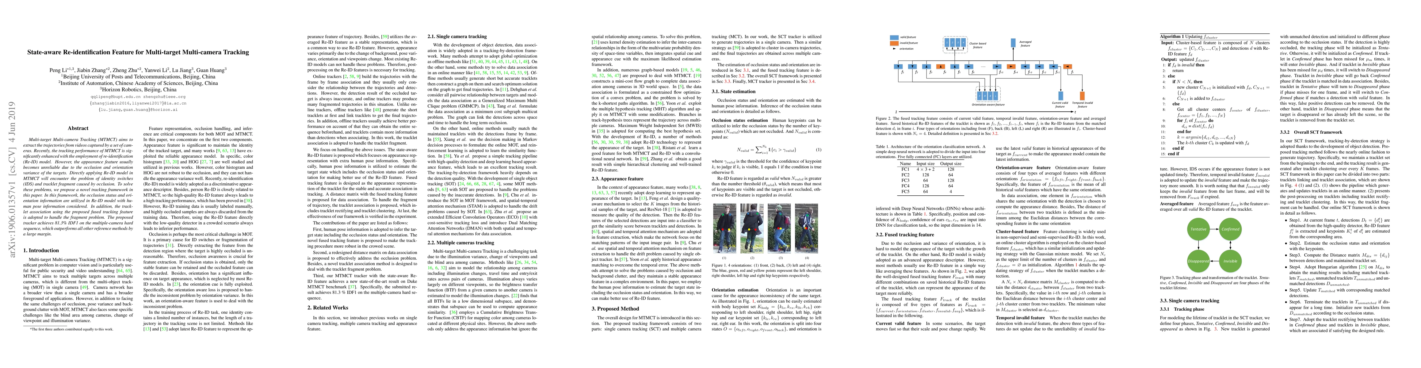 This paper proposes a novel state-aware re-identification feature for Multi-target Multi-camera Tracking (MTMCT) that incorporates occlusion status, orientation, and human pose information to enhance tracking performance and reduce identity switches and tracklet fragmentation. The proposed framework achieves an IDF1 score of 81.3% on challenging sequences, significantly outperforming existing methods.