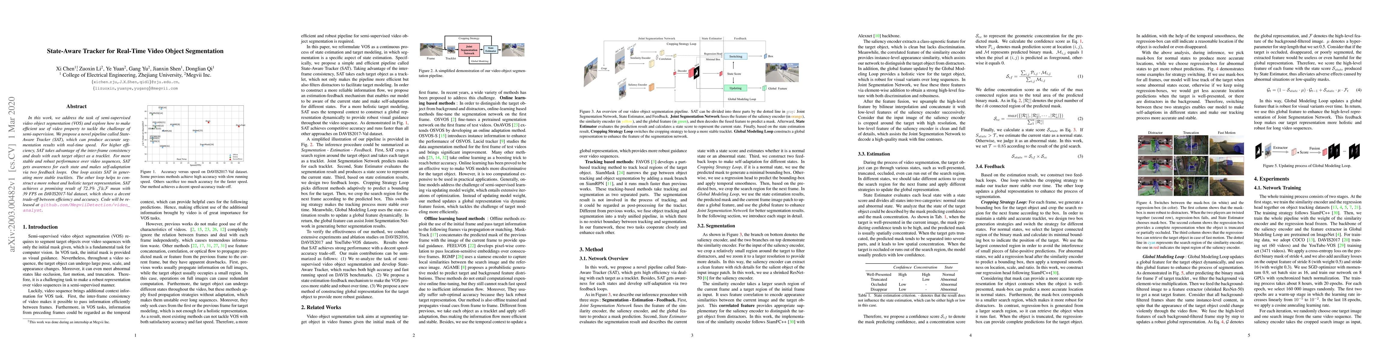 This paper proposes a State-Aware Tracker (SAT) for real-time semi-supervised video object segmentation, leveraging inter-frame consistency and adaptive feedback loops for stable and robust performance. SAT achieves a balance of efficiency and accuracy, with 72.3% J&F mean on DAVIS2017-Val dataset at 39 FPS.