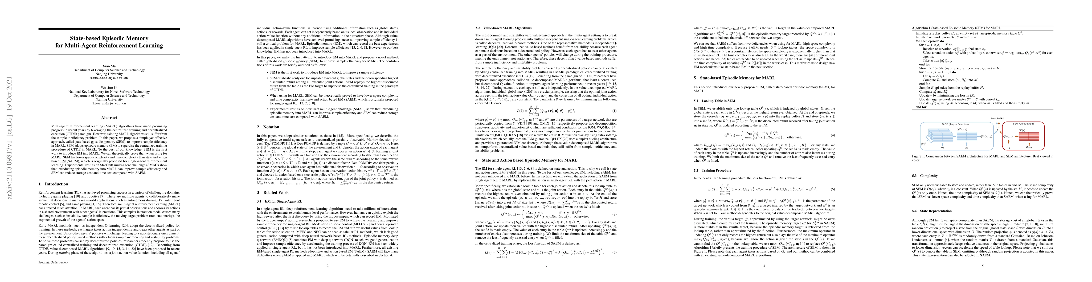 This paper proposes a state-based episodic memory (SEM) approach to enhance sample efficiency in multi-agent reinforcement learning (MARL) under the CTDE paradigm. Theoretical and empirical results demonstrate that SEM outperforms state and action-based episodic memory in terms of lower complexity and storage, as evidenced by experiments on SMAC.