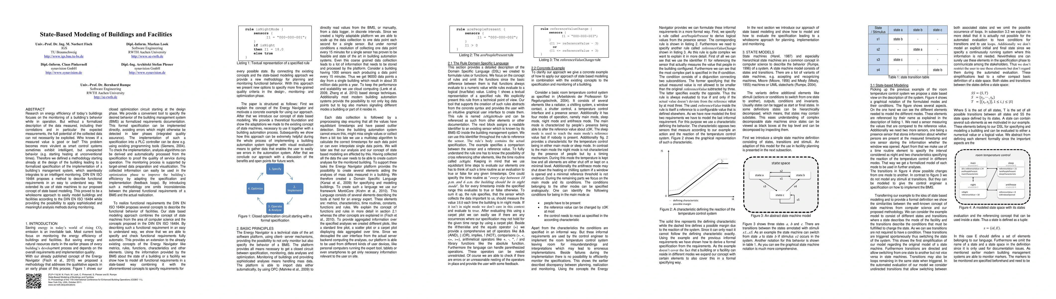 Research on energy efficiency of today's buildings focuses on the monitoring of a building's behavior while in operation. But without a formalized description of the data measured, including their correlations and in particular the expected measurements, the full potential of the collected data can not necessarily be exploited. Who knows if a measured value is good or bad? This problem becomes more virulent as smart control systems sometimes exhibit intelligent, but unexpected behavior (e.g. starting heating at unconventional times). Therefore we defined a methodology starting already at the design of the building leading to a formalized specification of the implementation of a building's management system, which seamlessly integrates to an intelligent monitoring. DIN EN ISO 16484 proposes a method to describe functional requirements in an easy to understand way. We extended its use of state machines to our proposed concept of state based modeling. This proved to be a wholesome approach to easily model buildings and facilities according to the DIN EN ISO 16484 while providing the possibility to apply sophisticated and meaningful analysis methods during monitoring.