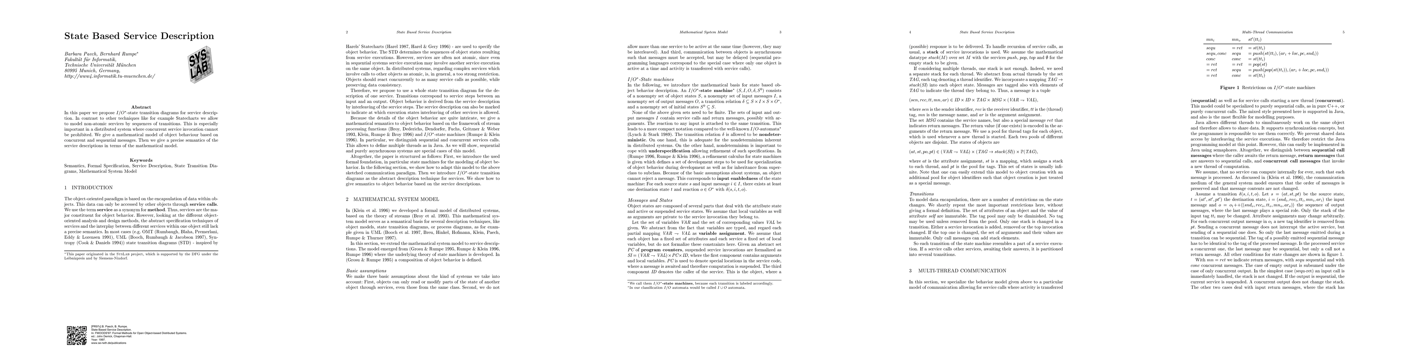 In this paper we propose I/O state transition diagrams for service description In contrast to other techniques like for example Statecharts we allow to model non atomic services by sequences of transitions This is especially important in a distributed system where concurrent service invocation cannot be prohibited We give a mathematical model of object behaviour based on concurrent and sequential messages Then we give a precise semantics of the service descriptions in terms of the mathematical model.