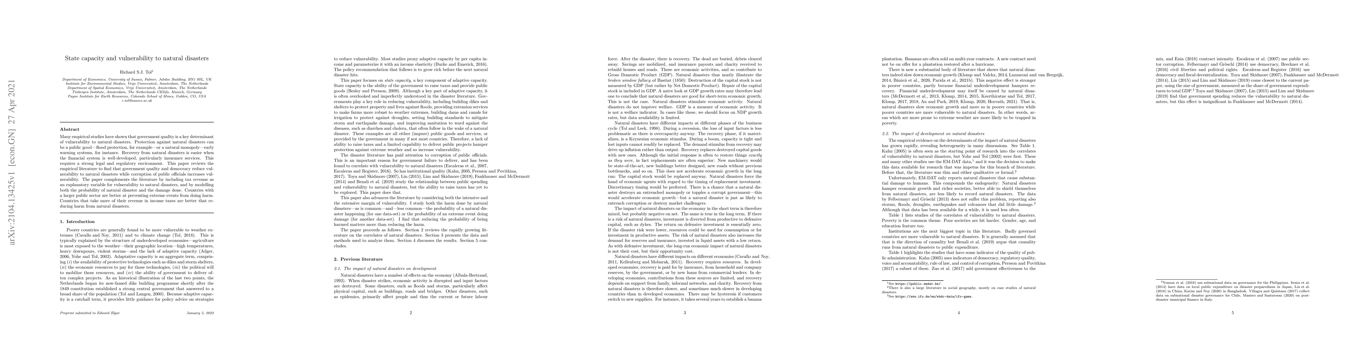 This paper reviews empirical studies to show that government quality and democracy lower vulnerability to natural disasters, while corruption increases it. It finds that countries with larger public sectors and higher income tax revenues are better at mitigating disaster damage.