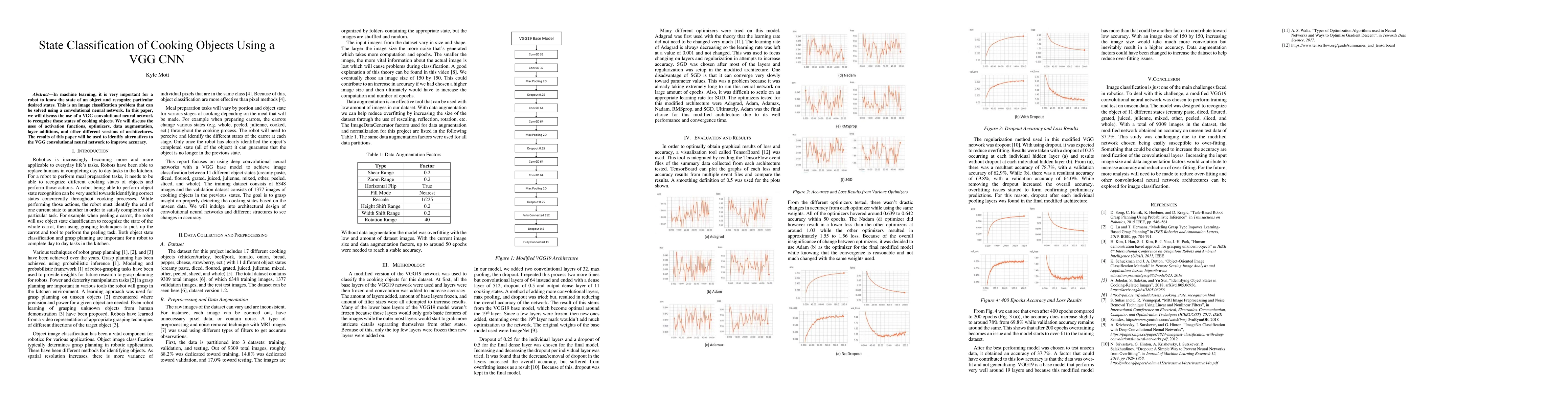In machine learning, it is very important for a robot to know the state of an object and recognize particular desired states. This is an image classification problem that can be solved using a convolutional neural network. In this paper, we will discuss the use of a VGG convolutional neural network to recognize those states of cooking objects. We will discuss the uses of activation functions, optimizers, data augmentation, layer additions, and other different versions of architectures. The results of this paper will be used to identify alternatives to the VGG convolutional neural network to improve accuracy.