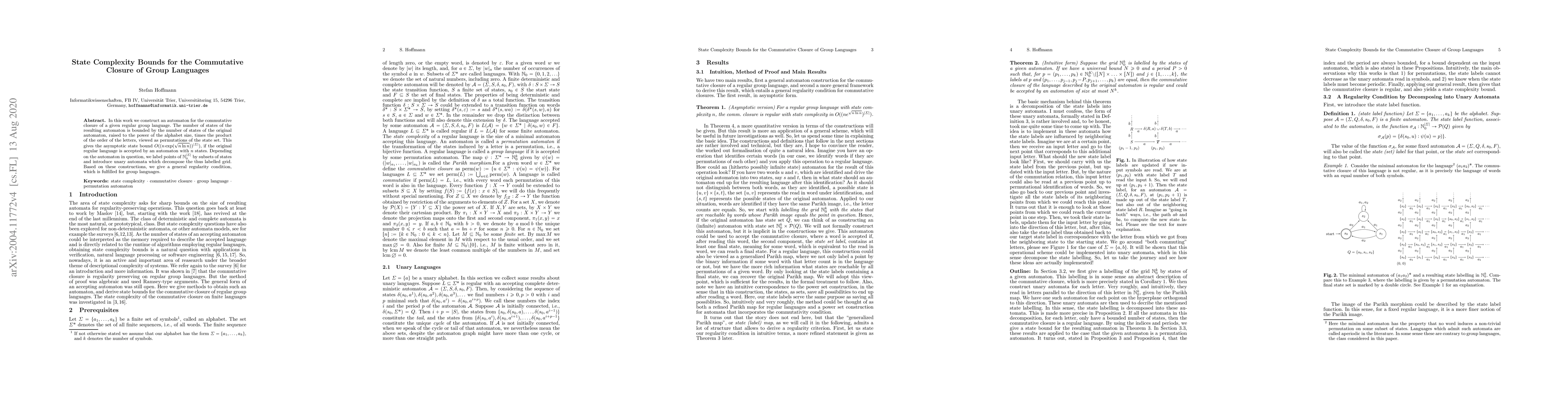 This paper constructs an automaton for the commutative closure of regular group languages, establishing an asymptotic state complexity bound of $O((n\exp(\sqrt{n\ln n}))^{|\Sigma|})$, where $n$ is the number of states in the original automaton and $|\Sigma|$ is the alphabet size. The work also introduces unary automata for decomposing labelled state subsets.