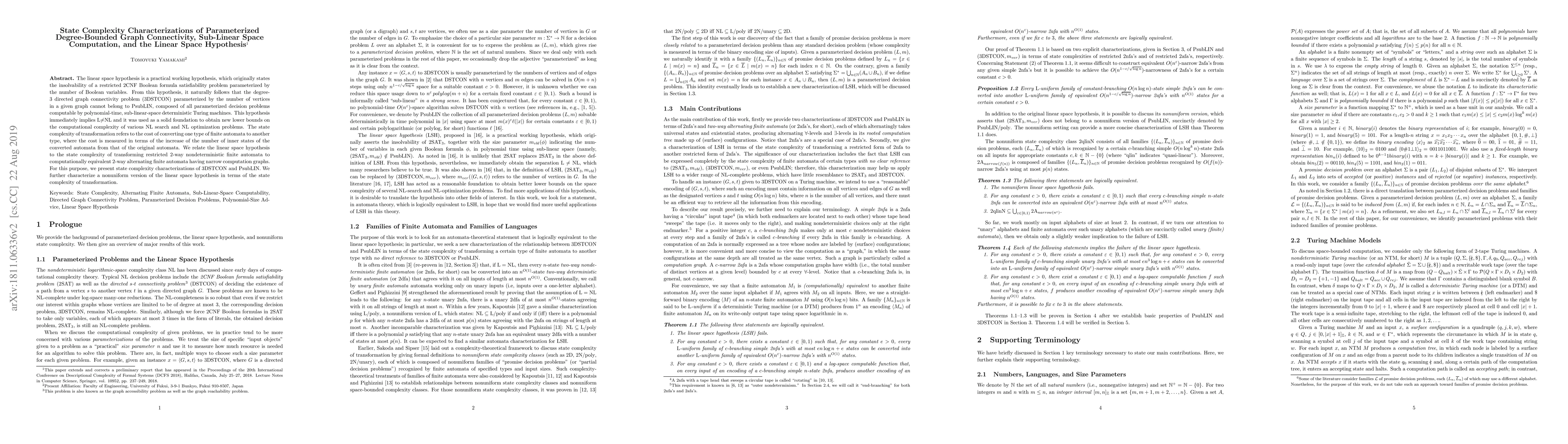 The linear space hypothesis is a practical working hypothesis, which originally states the insolvability of a restricted 2CNF Boolean formula satisfiability problem parameterized by the number of Boolean variables. From this hypothesis, it naturally follows that the degree-3 directed graph connectivity problem (3DSTCON) parameterized by the number of vertices in a given graph cannot belong to PsubLIN, composed of all parameterized decision problems computable by polynomial-time, sub-linear-space deterministic Turing machines. This hypothesis immediately implies L$\neq$NL and it was used as a solid foundation to obtain new lower bounds on the computational complexity of various NL search and NL optimization problems. The state complexity of transformation refers to the cost of converting one type of finite automata to another type, where the cost is measured in terms of the increase of the number of inner states of the converted automata from that of the original automata. We relate the linear space hypothesis to the state complexity of transforming restricted 2-way nondeterministic finite automata to computationally equivalent 2-way alternating finite automata having narrow computation graphs. For this purpose, we present state complexity characterizations of 3DSTCON and PsubLIN. We further characterize a nonuniform version of the linear space hypothesis in terms of the state complexity of transformation.