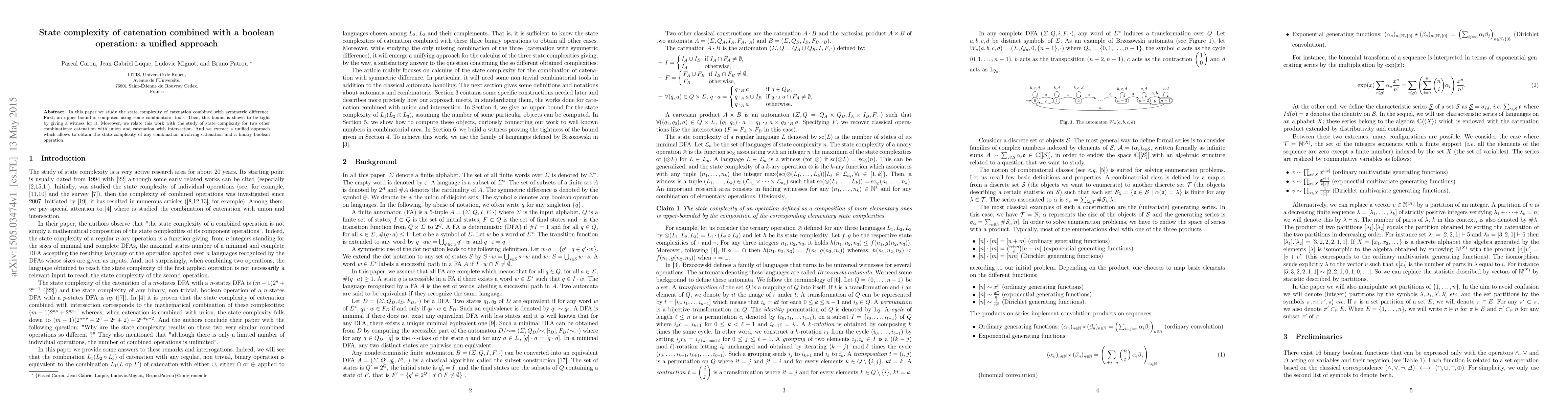 In this paper we study the state complexity of catenation combined with symmetric difference. First, an upper bound is computed using some combinatoric tools. Then, this bound is shown to be tight by giving a witness for it. Moreover, we relate this work with the study of state complexity for two other combinations: catenation with union and catenation with intersection. And we extract a unified approach which allows to obtain the state complexity of any combination involving catenation and a binary boolean operation.