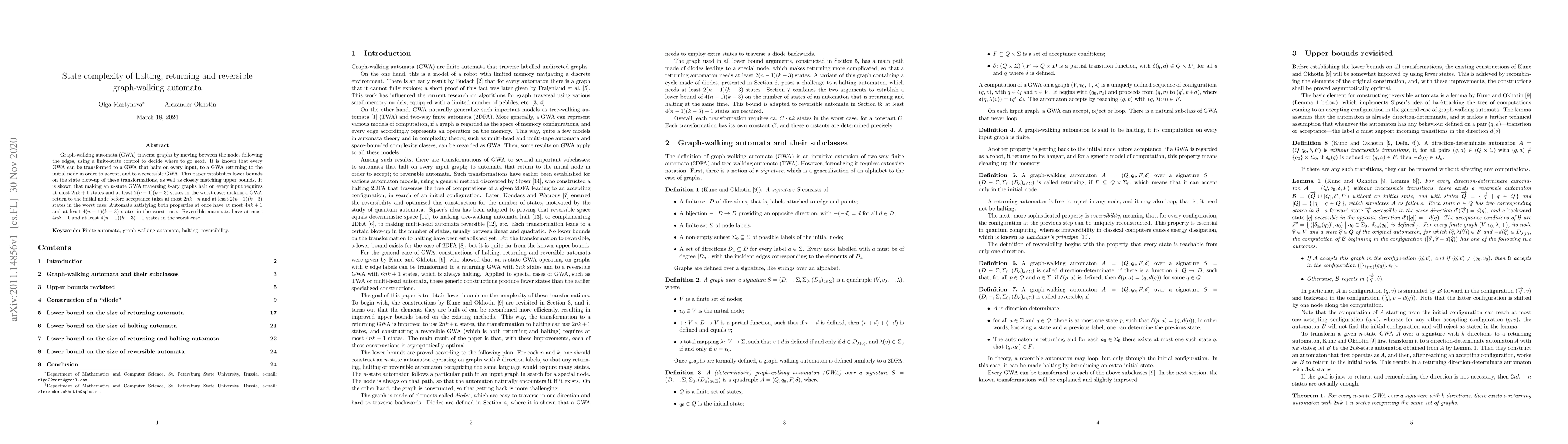 This paper sets lower bounds on state complexity for graph-walking automata transformations, establishing that halting and returning automata require at least 2(n-1)(k-3) states, while reversible automata need 4(n-1)(k-3)-1 states, with upper bounds of 2nk+1, 2nk+n, and 4nk+1 respectively.