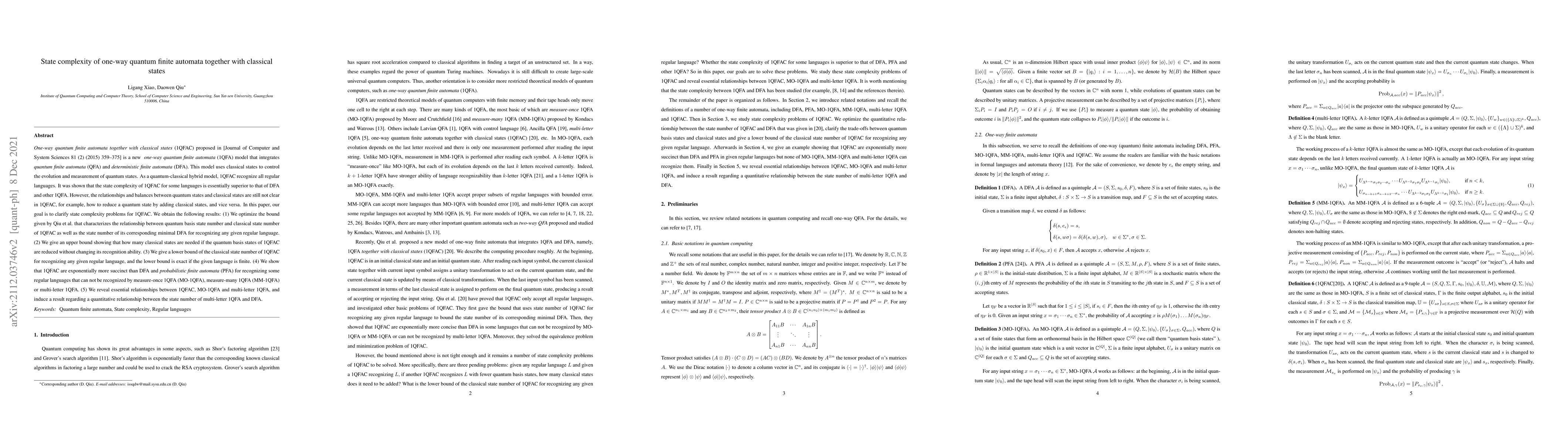 This paper investigates the state complexity of one-way quantum finite automata with classical states (1QFAC), optimizing the relationship between quantum and classical states and establishing bounds on classical state requirements. It demonstrates 1QFAC's superior succinctness over DFA and PFA for certain regular languages.