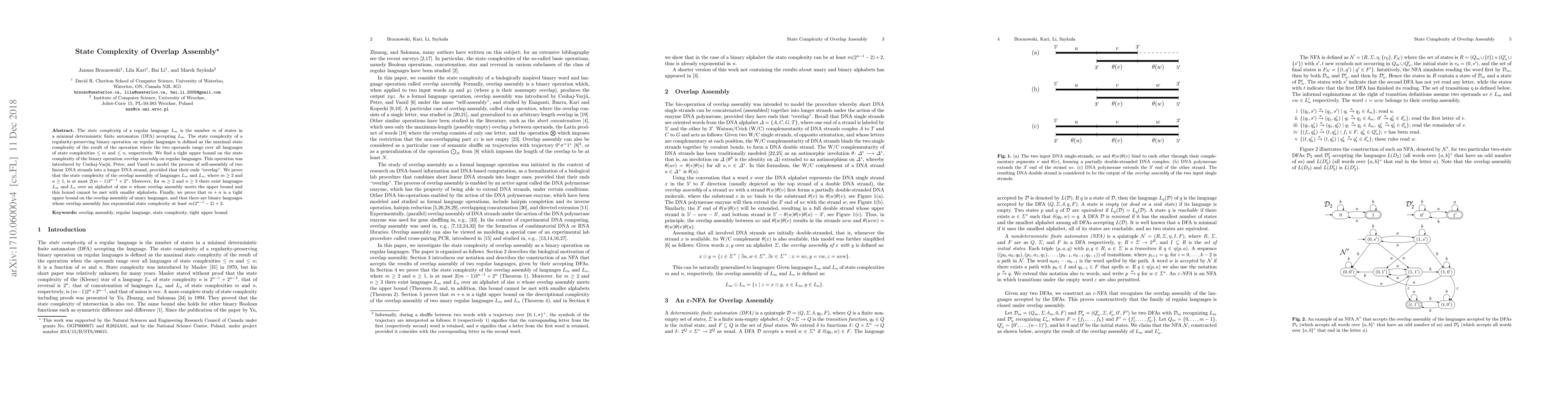 This research paper presents a tight upper bound on the state complexity of the binary operation 'overlap assembly' on regular languages, modeled after DNA strand self-assembly. The bound is 2(m-1)3^(n-1) + 2^n for languages L_m and L_n with m>=2 and n>=1. For m>=2 and n>=3, specific languages meeting this bound are identified, and the necessity of larger alphabets for these bounds is shown. The paper also asserts that m+n is a tight upper bound for unary languages, and exponential state complexity is proven for certain binary languages.