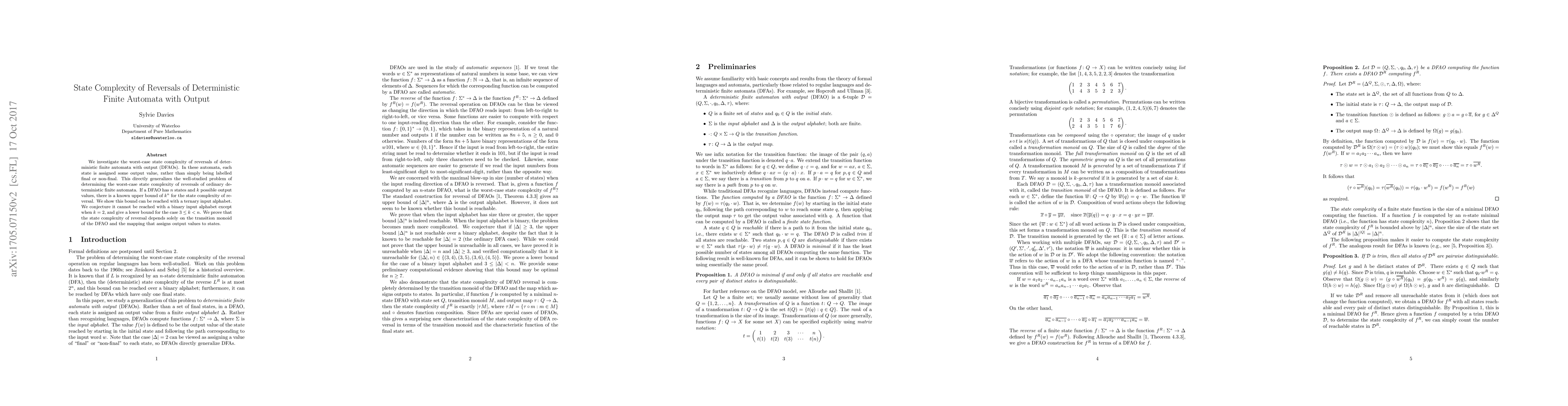 This paper examines the worst-case state complexity of reversing deterministic finite automata with output (DFAOs), which assign output values to each state. It demonstrates that the upper bound of $k^n$ for state complexity can be achieved with a ternary input alphabet and conjectures that this bound cannot be achieved with a binary input alphabet except when there are two output values.