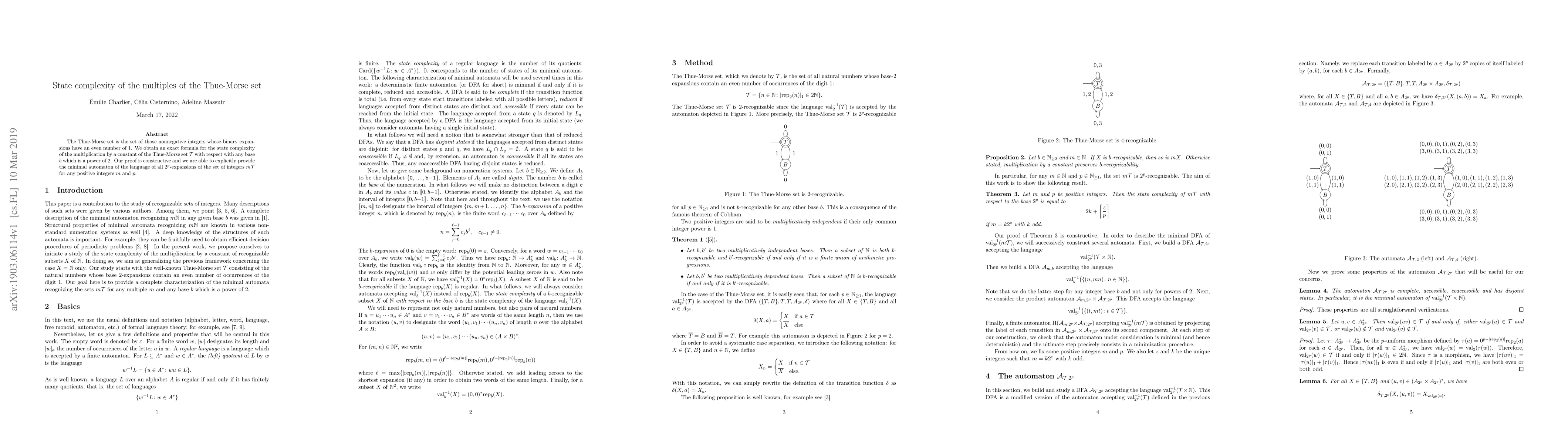 The Thue-Morse set is the set of those nonnegative integers whose binary expansions have an even number of $1$. We obtain an exact formula for the state complexity of the multiplication by a constant of the Thue-Morse set $\mathcal{T}$ with respect with any base $b$ which is a power of $2$. Our proof is constructive and we are able to explicitly provide the minimal automaton of the language of all $2^p$-expansions of the set of integers $m\mathcal{T}$ for any positive integers $m$ and $p$.