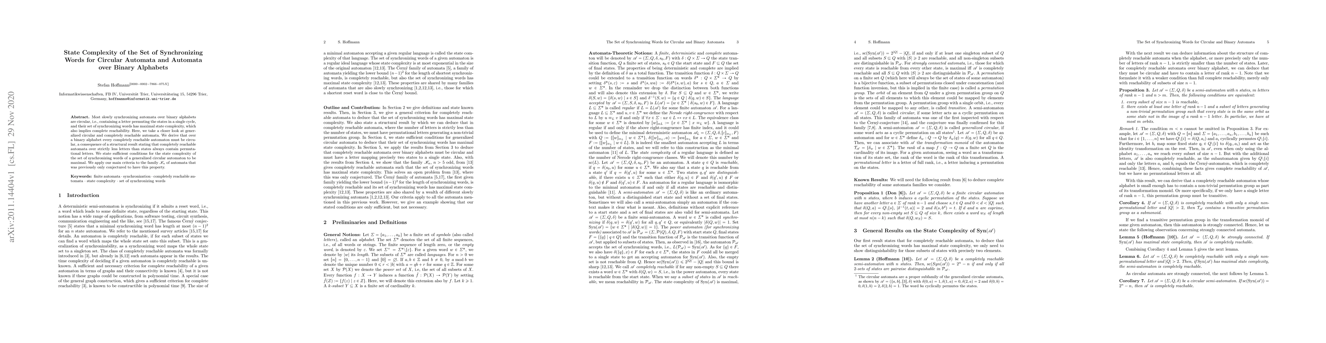 This paper investigates the state complexity of synchronizing words in circular automata over binary alphabets, proving that completely reachable automata must be circular. It also establishes sufficient conditions for maximal state complexity in generalized circular automata, applying these findings to confirm a conjecture about a specific family of automata.