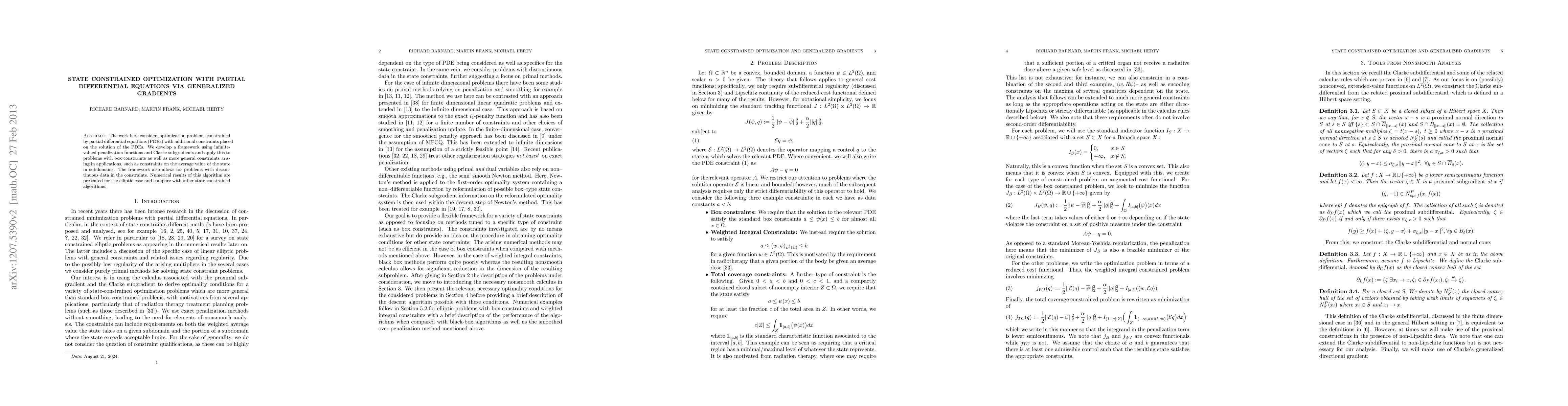 This paper develops a framework for optimizing solutions to PDEs with state constraints using generalized gradients and infinite-valued penalization functions. It applies this method to problems with box and average value constraints, and presents numerical results for elliptic PDEs, comparing its performance with other algorithms.