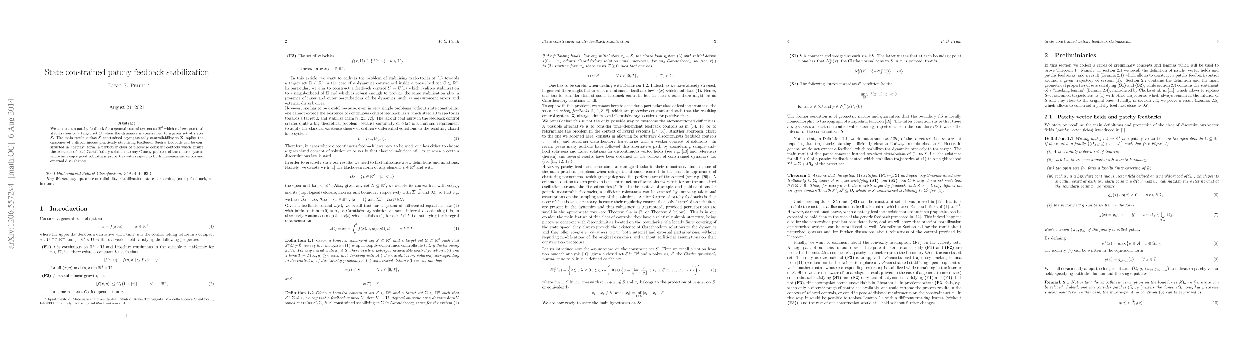This paper develops a patchy feedback control strategy for stabilizing a general control system to a target set under state constraints. It proves that $S$-constrained asymptotic controllability guarantees the existence of a discontinuous, practically stabilizing feedback, which can be implemented in a piecewise smooth "patchy" form, ensuring robustness against measurement errors and disturbances.
