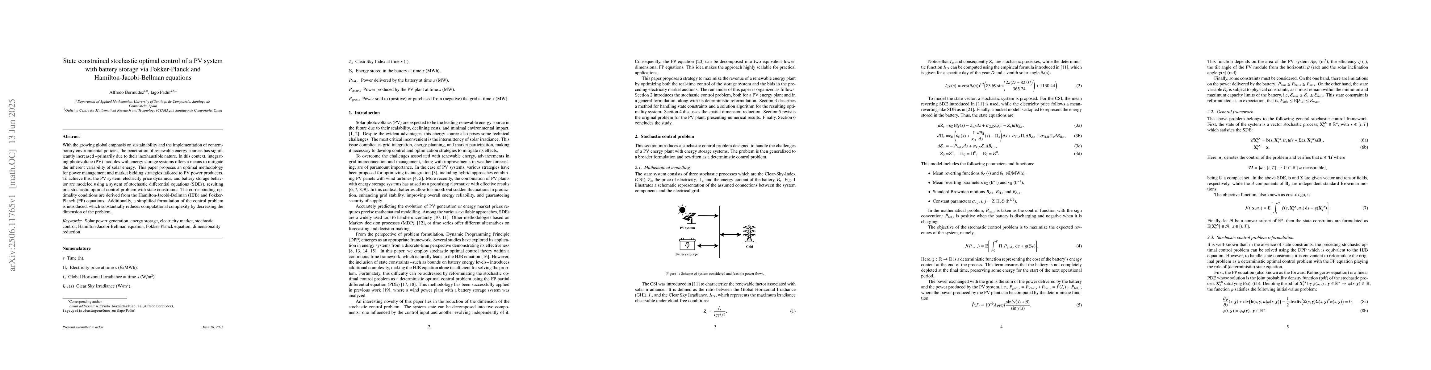 With the growing global emphasis on sustainability and the implementation of contemporary environmental policies, the penetration of renewable energy sources has significantly increased --primarily due to their inexhaustible nature. In this context, integrating photovoltaic (PV) modules with energy storage systems offers a means to mitigate the inherent variability of solar energy. This paper proposes an optimal methodology for power management and market bidding strategies tailored to PV power producers. To achieve this, the PV system, electricity price dynamics, and battery storage behavior are modeled using a system of stochastic differential equations (SDEs), resulting in a stochastic optimal control problem with state constraints. The corresponding optimality conditions are derived from the Hamilton-Jacobi-Bellman (HJB) and Fokker-Planck (FP) equations. Additionally, a simplified formulation of the control problem is introduced, which substantially reduces computational complexity by decreasing the dimension of the problem.