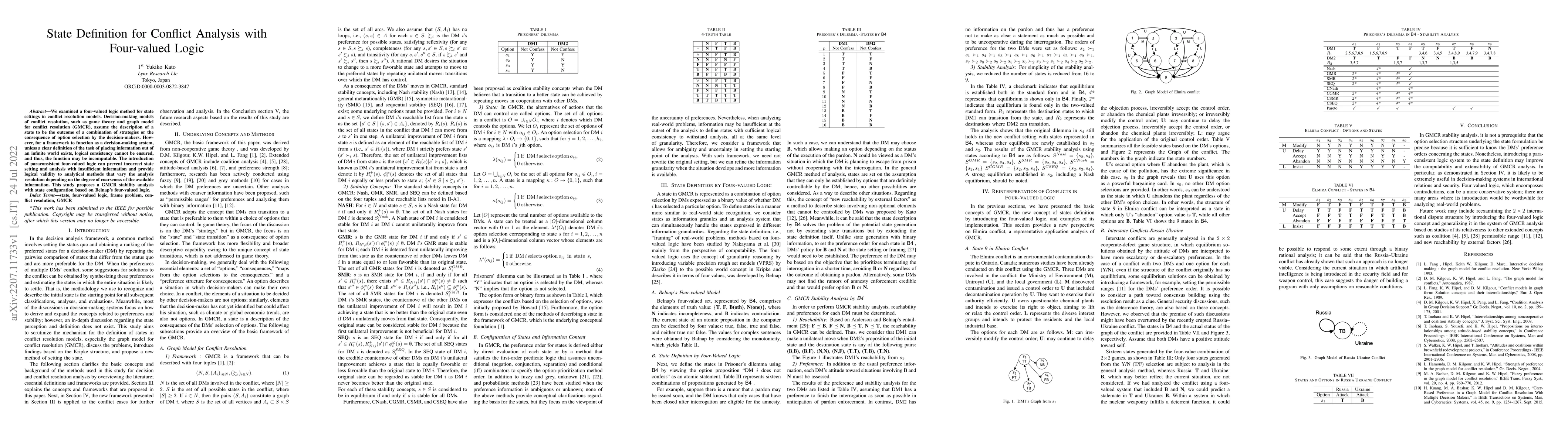 We examined a four-valued logic method for state settings in conflict resolution models. Decision-making models of conflict resolution, such as game theory and graph model for conflict resolution (GMCR), assume the description of a state to be the outcome of a combination of strategies or the consequence of option selection by the decision-makers. However, for a framework to function as a decision-making system, unless a clear definition of the task of placing information out of an infinite world exists, logical consistency cannot be ensured, and thus, the function may be incomputable. The introduction of paraconsistent four-valued logic can prevent incorrect state setting and analysis with insufficient information and provide logical validity to analytical methods that vary the analysis resolution depending on the degree of coarseness of the available information. This study proposes a GMCR stability analysis with state configuration based on Belnap's four-valued logic.