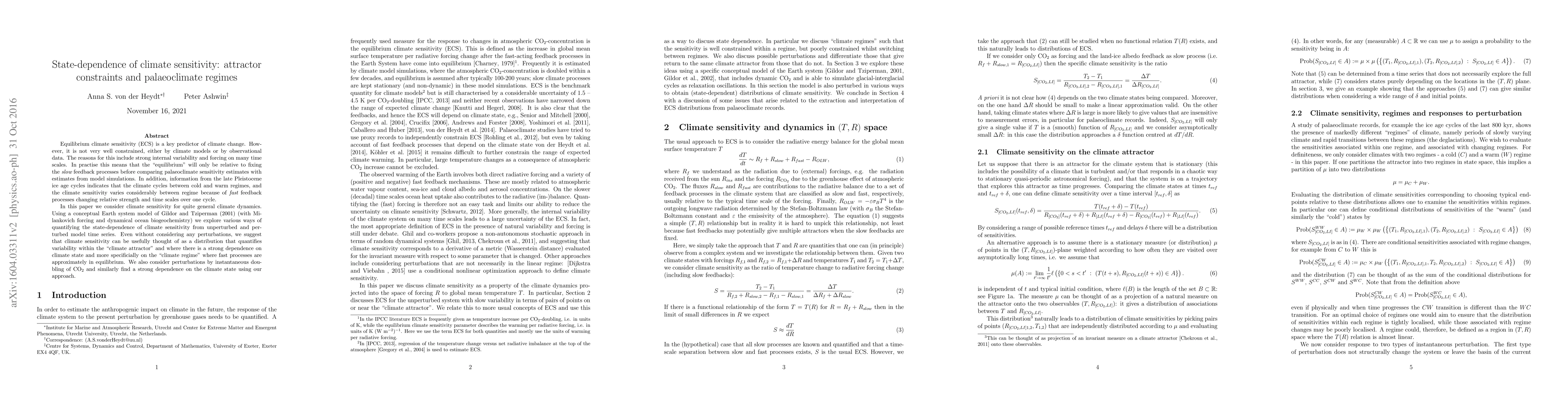 Equilibrium climate sensitivity (ECS) is a key predictor of climate change. However, it is not very well constrained, either by climate models or by observational data. The reasons for this include strong internal variability and forcing on many time scales. In practise this means that the 'equilibrium' will only be relative to fixing the slow feedback processes before comparing palaeoclimate sensitivity estimates with estimates from model simulations. In addition, information from the late Pleistocene ice age cycles indicates that the climate cycles between cold and warm regimes, and the climate sensitivity varies considerably between regime because of fast feedback processes changing relative strength and time scales over one cycle. In this paper we consider climate sensitivity for quite general climate dynamics. Using a conceptual Earth system model of Gildor and Tziperman (2001) (with Milankovich forcing and dynamical ocean biogeochemistry) we explore various ways of quantifying the state-dependence of climate sensitivity from unperturbed and perturbed model time series. Even without considering any perturbations, we suggest that climate sensitivity can be usefully thought of as a distribution that quantifies variability within the 'climate attractor' and where there is a strong dependence on climate state and more specificially on the 'climate regime' where fast processes are approximately in equilibrium. We also consider perturbations by instantaneous doubling of CO$_2$ and similarly find a strong dependence on the climate state using our approach.