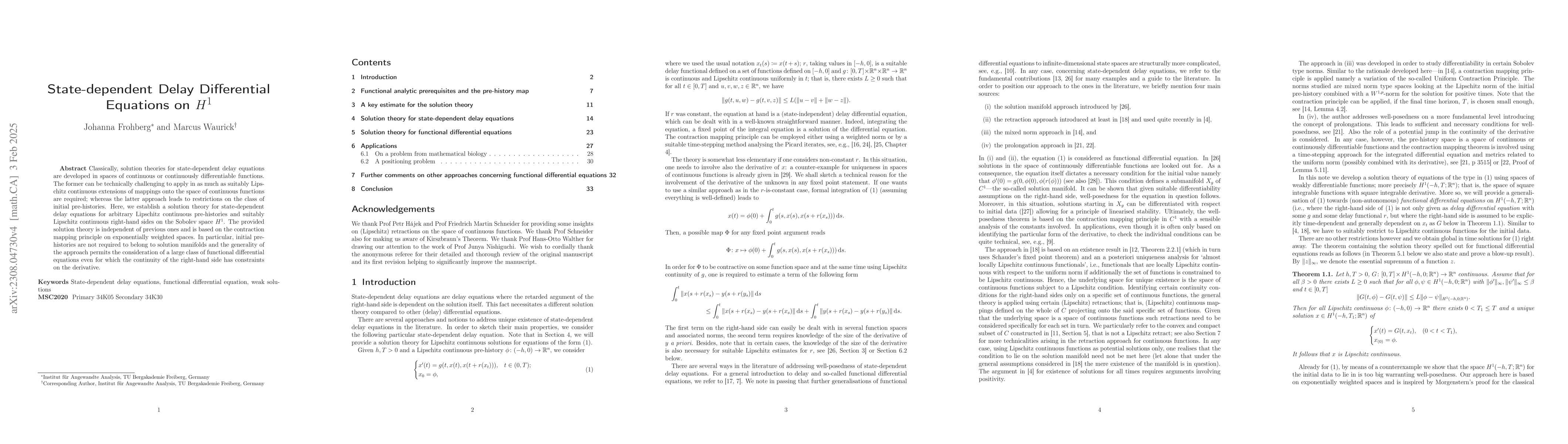 This paper establishes a novel solution theory for state-dependent delay differential equations on the Sobolev space $H^1$, ensuring unique existence for arbitrary Lipschitz continuous pre-histories. The approach leverages the contraction mapping principle on exponentially weighted spaces for global well-posedness.