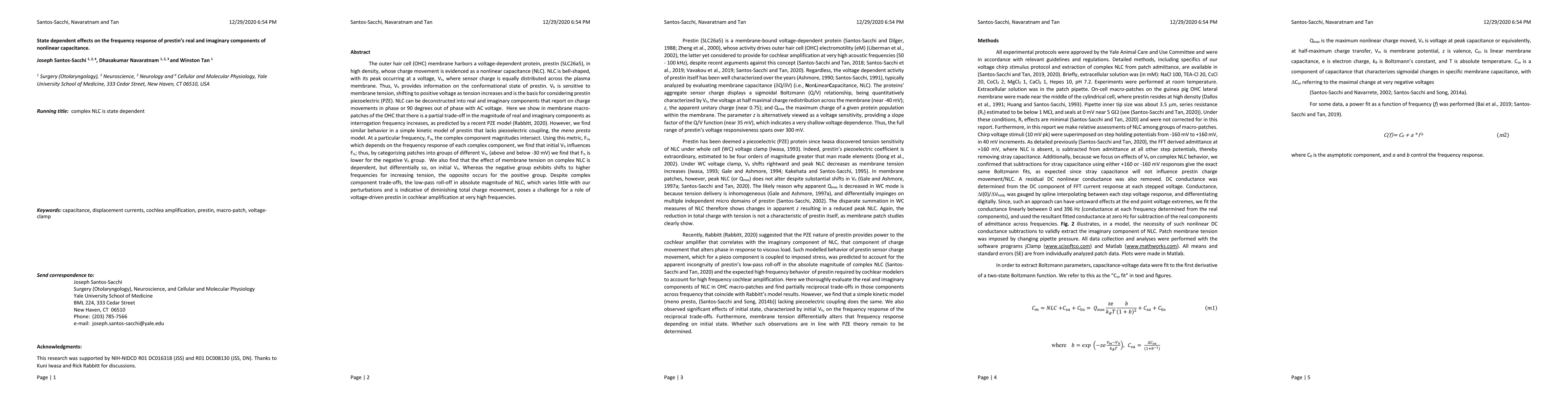 The outer hair cell (OHC) membrane harbors a voltage-dependent protein, prestin (SLC26a5), in high density, whose charge movement is evidenced as a nonlinear capacitance (NLC). NLC is bell-shaped, with its peak occurring at a voltage, Vh, where sensor charge is equally distributed across the plasma membrane. Thus, Vh provides information on the conformational state of prestin. Vh is sensitive to membrane tension, shifting to positive voltage as tension increases and is the basis for considering prestin piezoelectric (PZE). NLC can be deconstructed into real and imaginary components that report on charge movements in phase or 90 degrees out of phase with AC voltage. Here we show in membrane macro-patches of the OHC that there is a partial trade-off in the magnitude of real and imaginary components as interrogation frequency increases, as predicted by a recent PZE model (Rabbitt, 2020). However, we find similar behavior in a simple kinetic model of prestin that lacks piezoelectric coupling, the meno presto model. At a particular frequency, Fis, the complex component magnitudes intersect. Using this metric, Fis, which depends on the frequency response of each complex component, we find that initial Vh influences Fis; thus, by categorizing patches into groups of different Vh, (above and below -30 mV) we find that Fis is lower for the negative Vh group. We also find that the effect of membrane tension on complex NLC is dependent, but differentially so, on initial Vh. Whereas the negative group exhibits shifts to higher frequencies for increasing tension, the opposite occurs for the positive group. Despite complex component trade-offs, the low-pass roll-off in absolute magnitude of NLC, which varies little with our perturbations and is indicative of diminishing total charge movement, poses a challenge for a role of voltage-driven prestin in cochlear amplification at very high frequencies.