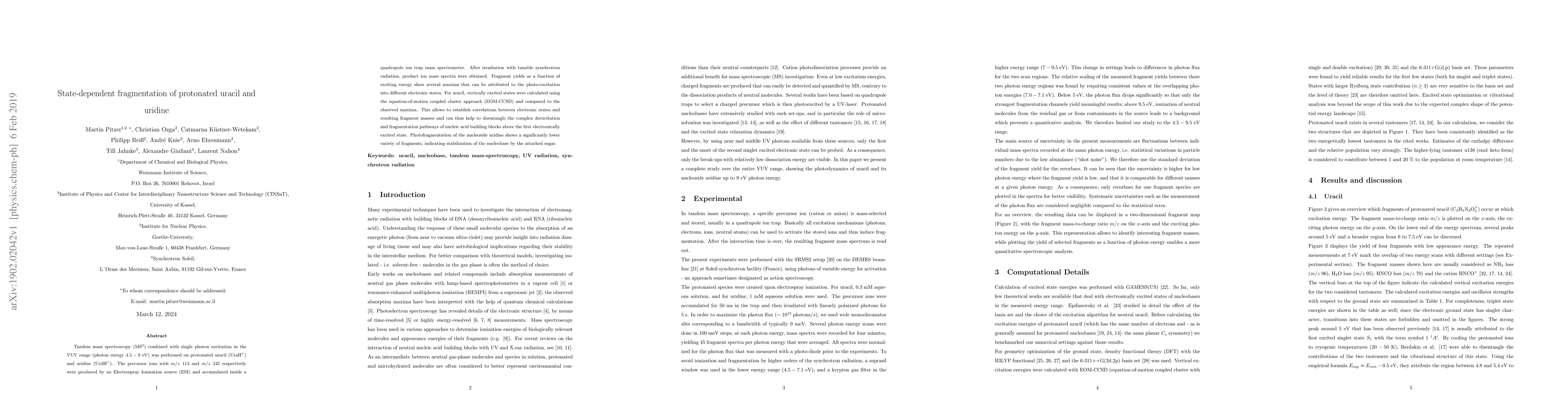 This paper investigates the state-dependent fragmentation of protonated uracil and uridine using tandem mass spectrometry and VUV single photon excitation. The study reveals distinct fragmentation patterns correlated with electronic states, providing insights into the deexcitation and fragmentation pathways of nucleic acid components.