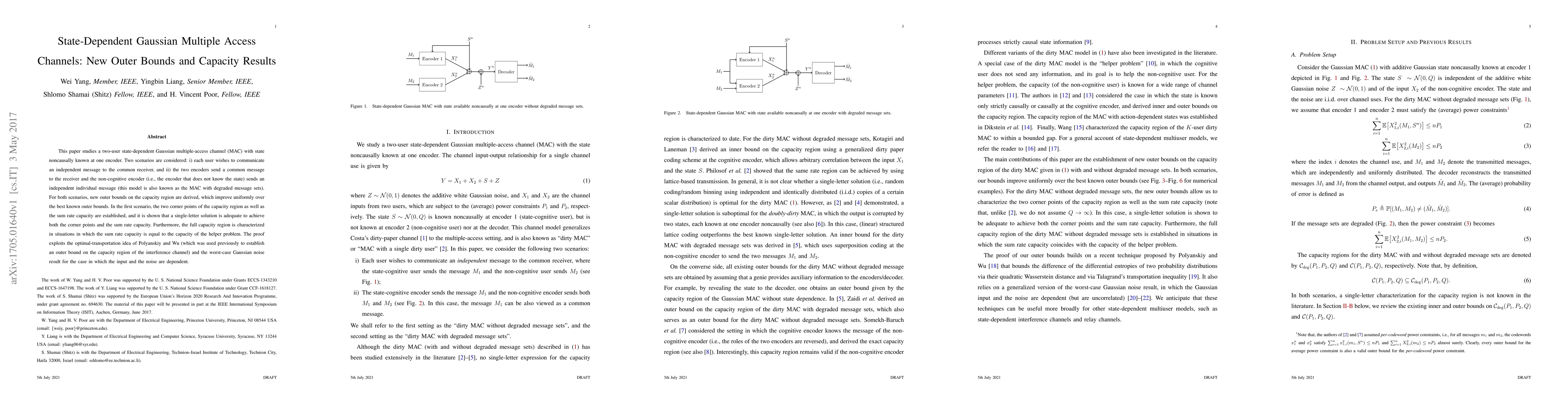 Researchers derived new outer bounds for capacity in two-user state-dependent Gaussian multiple-access channels, improving upon existing results and establishing a single-letter solution to achieve optimal performance.