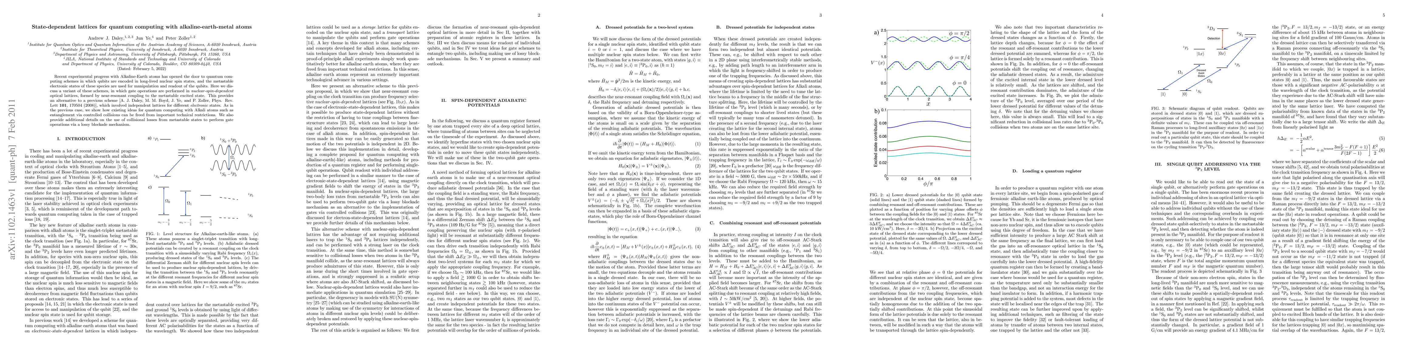 Recent experimental progress with Alkaline-Earth atoms has opened the door to quantum computing schemes in which qubits are encoded in long-lived nuclear spin states, and the metastable electronic states of these species are used for manipulation and readout of the qubits. Here we discuss a variant of these schemes, in which gate operations are performed in nuclear-spin-dependent optical lattices, formed by near-resonant coupling to the metastable excited state. This provides an alternative to a previous scheme [A. J. Daley, M. M. Boyd, J. Ye, and P. Zoller, Phys. Rev. Lett 101, 170504 (2008)], which involved independent lattices for different electronic states. As in the previous case, we show how existing ideas for quantum computing with Alkali atoms such as entanglement via controlled collisions can be freed from important technical restrictions. We also provide additional details on the use of collisional losses from metastable states to perform gate operations via a lossy blockade mechanism.
