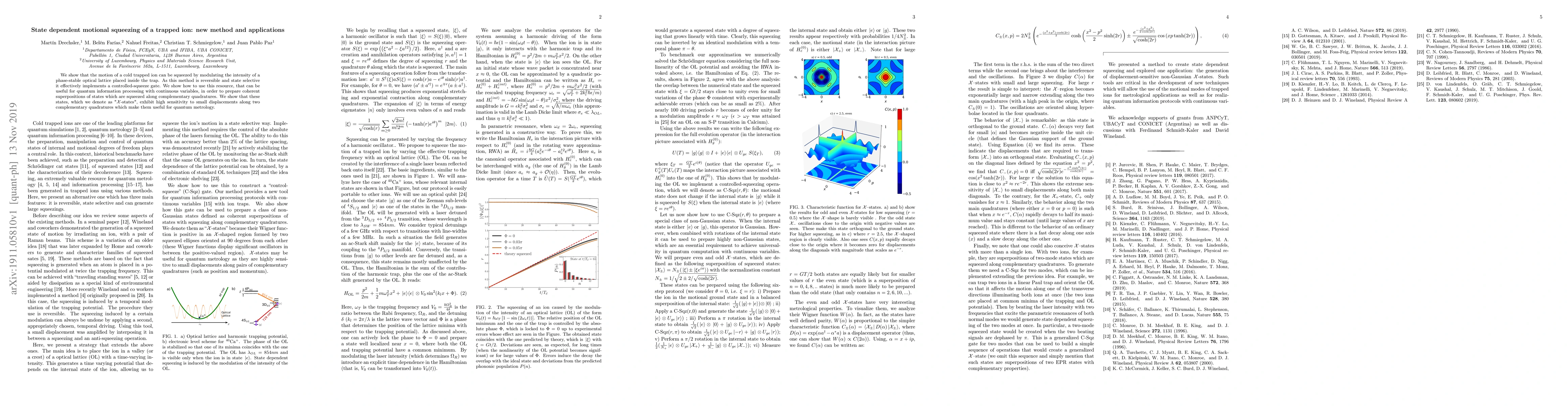 We show that the motion of a cold trapped ion can be squeezed by modulating the intensity of a phase-stable optical lattice placed inside the trap. As this method is reversible and state selective it effectively implements a controlled-squeeze gate. We show how to use this resource, that can be useful for quantum information processing with continuous variables, in order to prepare coherent superpositions of states which are squeezed along complementary quadratures. We show that these states, which we denote as "${\mathcal X}$-states", exhibit high sensitivity to small displacements along two complementary quadratures which make them useful for quantum metrology.