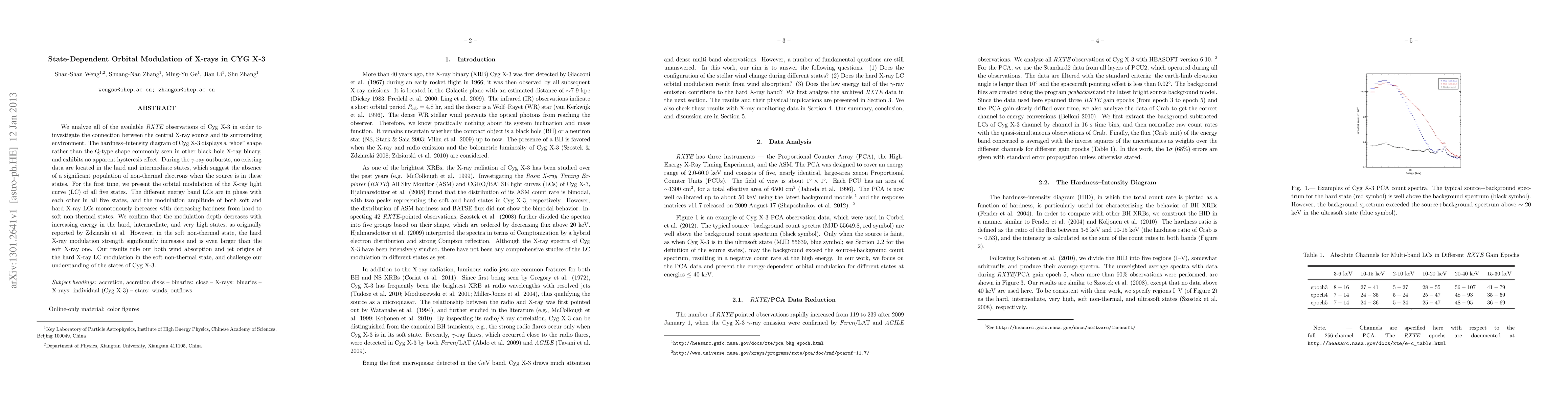 We analyze all of the available {\it RXTE} observations of Cyg X-3 in order to investigate the connection between the central X-ray source and its surrounding environment. The hardness--intensity diagram of Cyg X-3 displays a "shoe" shape rather than the Q-type shape commonly seen in other black hole X-ray binary, and exhibits no apparent hysteresis effect. During the $\gamma$-ray outbursts, no existing data are located in the hard and intermediate states, which suggest the absence of a significant population of non-thermal electrons when the source is in these states. For the first time, we present the orbital modulation of the X-ray light curve (LC) of all five states. The different energy band LCs are in phase with each other in all five states, and the modulation amplitude of both soft and hard X-ray LCs monotonously increases with decreasing hardness from hard to soft non-thermal states. We confirm that the modulation depth decreases with increasing energy in the hard, intermediate, and very high states, as originally reported by Zdziarski et al. However, in the soft non-thermal state, the hard X-ray modulation strength significantly increases and is even larger than the soft X-ray one. Our results rule out both wind absorption and jet origins of the hard X-ray LC modulation in the soft non-thermal state, and challenge our understanding of the states of Cyg X-3.