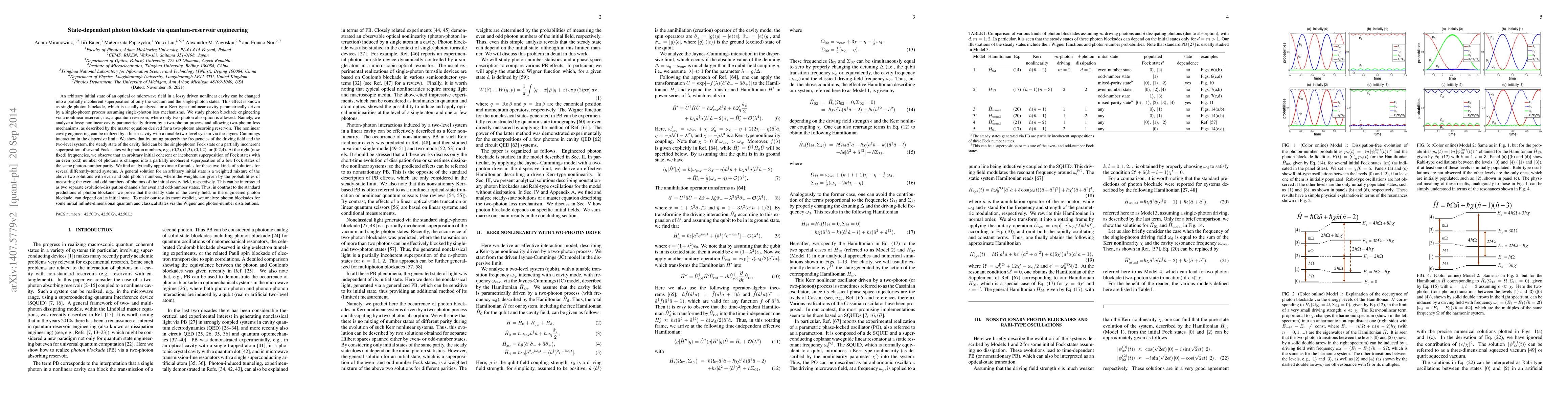 An arbitrary initial state of an optical or microwave field in a lossy driven nonlinear cavity can be changed, in the steady-state limit, into a partially incoherent superposition of only the vacuum and the single-photon states. This effect is known as single-photon blockade, which is usually analyzed for a Kerr-type nonlinear cavity parametrically driven by a single-photon process assuming single-photon loss mechanisms. We study photon blockade engineering via a squeezed reservoir, i.e., a quantum reservoir, where only two-photon absorption is allowed. Namely, we analyze a lossy nonlinear cavity parametrically driven by a two-photon process and allowing two-photon loss mechanisms, as described by the master equation derived for a two-photon absorbing reservoir. The nonlinear cavity engineering can be realized by a linear cavity with a tunable two-level system via the Jaynes-Cummings interaction in the dispersive limit. We show that by tuning properly the frequencies of the driving field and the two-level system, the steady state of the cavity field can be the single-photon Fock state or a partially incoherent superposition of several Fock states with photon numbers, e.g., (0,2), (1,3), (0,1,2), or (0,2,4). We observe that an arbitrary initial coherent or incoherent superposition of Fock states with an even (odd) number of photons can be changed into a partially incoherent superposition of a few Fock states of the same photon-number parity. A general solution for an arbitrary initial state is a weighted mixture of the above two solutions with even and odd photon numbers, where the weights are given by the probabilities of measuring the even and odd numbers of photons of the initial cavity field, respectively. Thus, in contrast to the standard photon blockade, we prove that the steady state in the engineered photon blockade, can depend on its initial state.