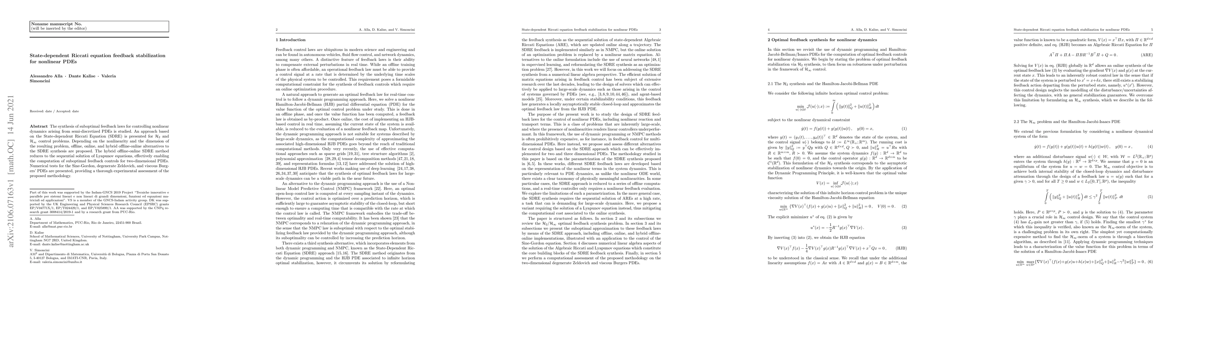 This paper presents a State-dependent Riccati Equation (SDRE) approach for synthesizing suboptimal feedback laws to control nonlinear dynamics from semi-discretized PDEs, addressing H2 and Hinf control problems. It proposes offline, online, and hybrid offline-online methods, with the hybrid method reducing to the sequential solution of Lyapunov equations, and demonstrates the methodology through numerical tests on several PDEs.