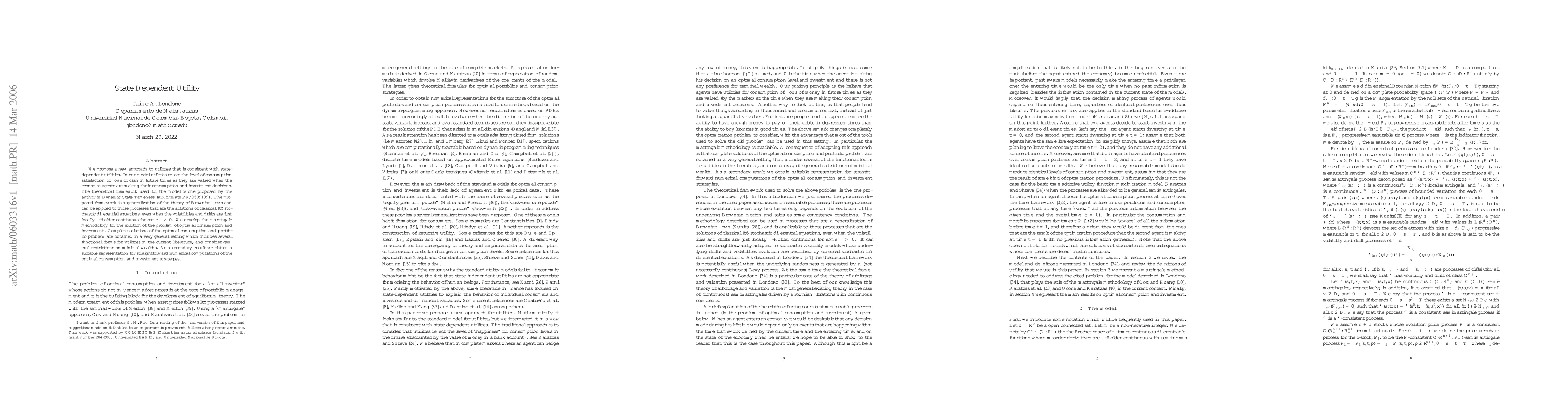We propose a new approach to utilities that is consistent with state-dependent utilities. In our model utilities reflect the level of consumption satisfaction of flows of cash in future times as they are valued when the economic agents are making their consumption and investment decisions. The theoretical framework used for the model is one proposed by the author in Dynamic State Tameness {arXiv:math.PR/0509139}. The proposed framework is a generalization of the theory of Brownian flows and can be applied to those processes that are the solutions of classical It^o stochastic differential equations, even when the volatilities and drifts are just locally $\delta$-Holder continuous for some $\delta>0$. We develop the martingale methodology for the solution of the problem of optimal consumption and investment. Complete solutions of the optimal consumption and portfolio problem are obtained in a very general setting which includes several functional forms for utilities in the current literature, and consider general restrictions on minimal wealths. As a secondary result we obtain a suitable representation for straightforward numerical computations of the optimal consumption and investment strategies.