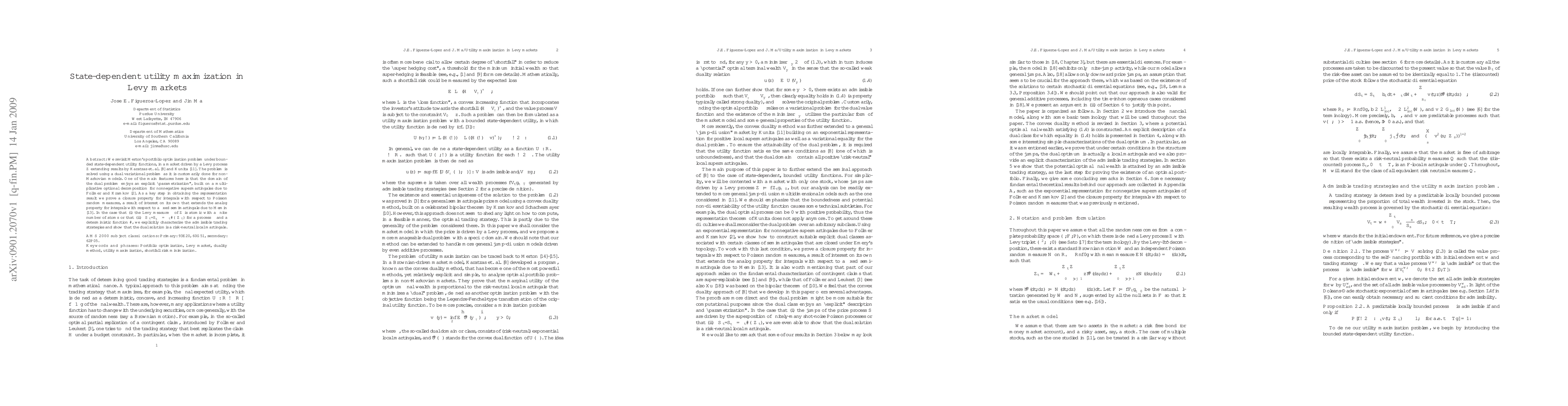 This paper solves Merton's portfolio optimization problem in Lévy markets using bounded state-dependent utility functions, extending prior results. It employs a dual variational approach and characterizes admissible trading strategies under specific conditions, showing the dual solution as a risk-neutral local martingale.