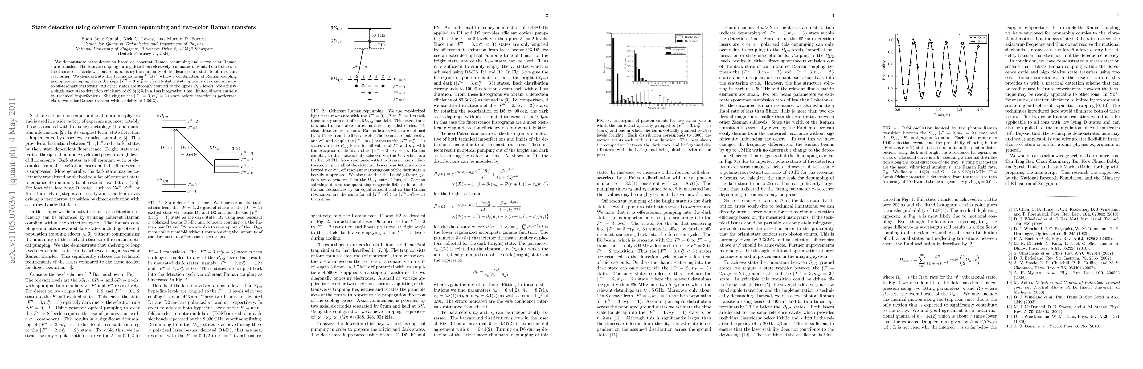 We demonstrate state detection based on coherent Raman repumping and a two-color Raman state transfer. The Raman coupling during detection selectively eliminates unwanted dark states in the fluorescence cycle without compromising the immunity of the desired dark state to off-resonant scattering. We demonstrate this technique using $^{137}\mathrm{Ba}^+$ where a combination of Raman coupling and optical pumping leaves the $D_{3/2}$ $\ket{F"=3,m_F"=3}$ metastable state optically dark and immune to off-resonant scattering. All other states are strongly coupled to the upper $P_{1/2}$ levels. We achieve a single shot state-detection efficiency of $89.6(3)%$ in a $1\mathrm{ms}$ integration time, limited almost entirely by technical imperfections. Shelving to the $\ket{F"=3,m_F"=3}$ state before detection is performed via a two-color Raman transfer with a fidelity of $1.00(3)$.