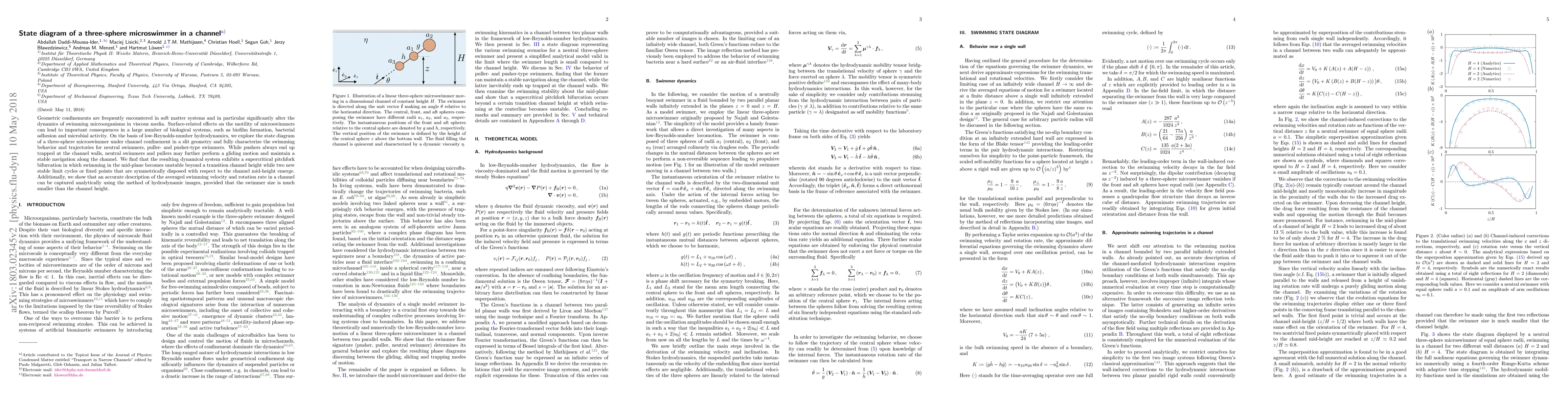 This paper investigates the dynamics of a three-sphere microswimmer in a channel, focusing on how confinement alters its swimming behavior. It characterizes the state diagram, revealing that pushers get trapped at walls, while neutral and puller swimmers can glide and navigate stably, with a supercritical pitchfork bifurcation occurring beyond a certain channel height.