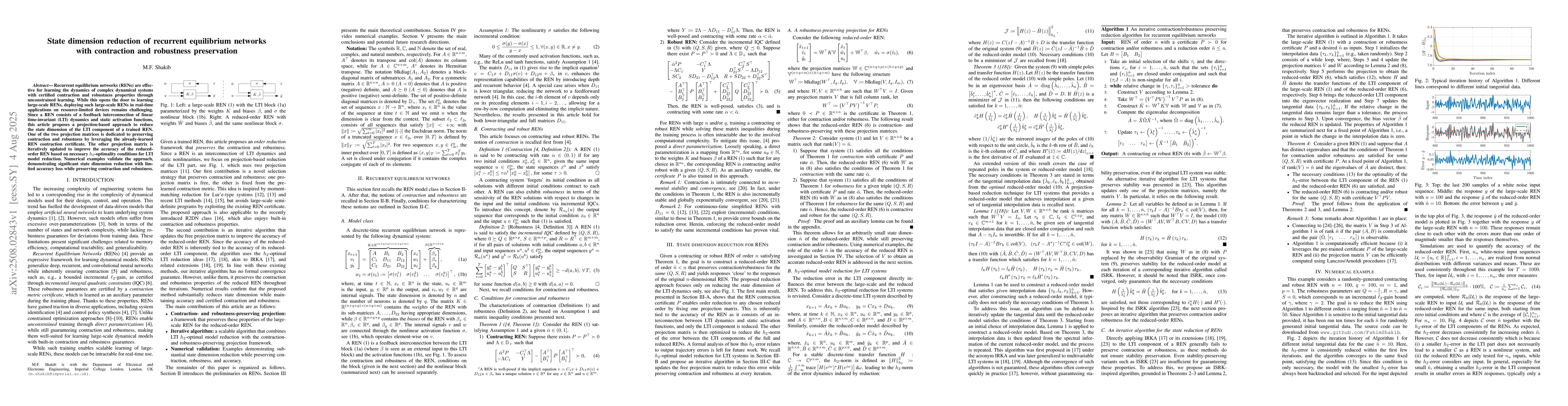 Recurrent equilibrium networks (RENs) are effective for learning the dynamics of complex dynamical systems with certified contraction and robustness properties through unconstrained learning. While this opens the door to learning large-scale RENs, deploying such large-scale RENs in real-time applications on resource-limited devices remains challenging. Since a REN consists of a feedback interconnection of linear time-invariant (LTI) dynamics and static activation functions, this article proposes a projection-based approach to reduce the state dimension of the LTI component of a trained REN. One of the two projection matrices is dedicated to preserving contraction and robustness by leveraging the already-learned REN contraction certificate. The other projection matrix is iteratively updated to improve the accuracy of the reduced-order REN based on necessary $h_2$-optimality conditions for LTI model reduction. Numerical examples validate the approach, demonstrating significant state dimension reduction with limited accuracy loss while preserving contraction and robustness.