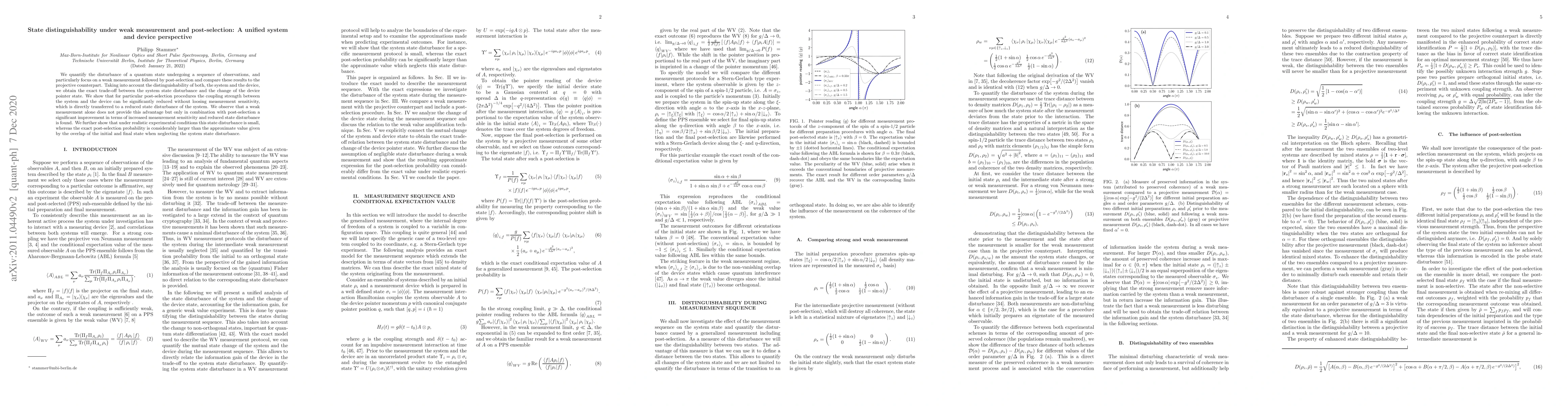 We quantify the disturbance of a quantum state undergoing a sequence of observations, and particularly focus on a weak measurement followed by post-selection and compare these results to the projective counterpart. Taking into account the distinguishability of both, the system and the device, we obtain the exact trade-off between the system state disturbance and the change of the device pointer state. We show that for particular post-selection procedures the coupling strength between the system and the device can be significantly reduced without loosing measurement sensitivity, which is directly transferred to a reduced state disturbance of the system. We observe that a weak measurement alone does not provide this advantage but only in combination with post-selection a significant improvement in terms of increased measurement sensitivity and reduced state disturbance is found. We further show that under realistic experimental conditions this state disturbance is small, whereas the exact post-selection probability is considerably larger than the approximate value given by the overlap of the initial and final state when neglecting the system state disturbance.
