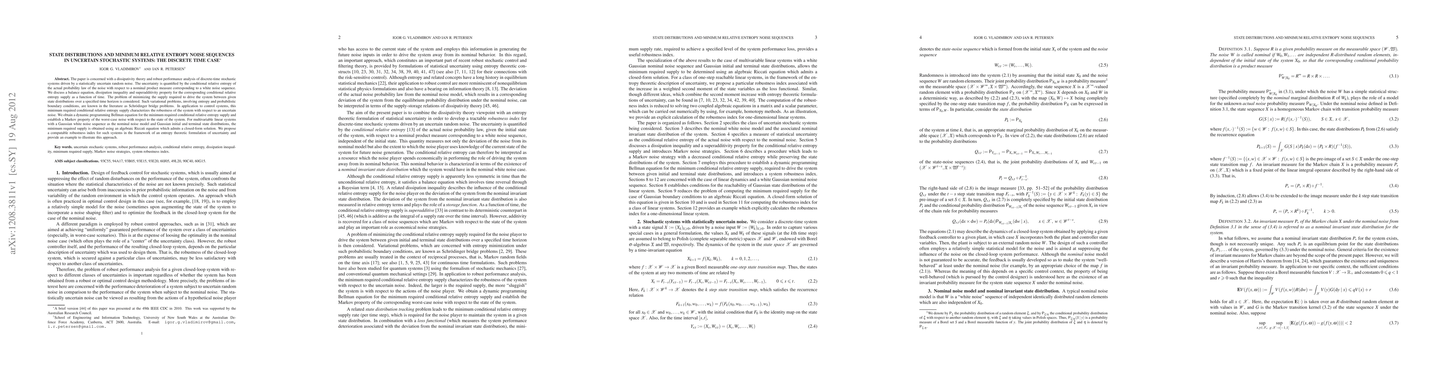 The paper is concerned with a dissipativity theory and robust performance analysis of discrete-time stochastic systems driven by a statistically uncertain random noise. The uncertainty is quantified by the conditional relative entropy of the actual probability law of the noise with respect to a nominal product measure corresponding to a white noise sequence. We discuss a balance equation, dissipation inequality and superadditivity property for the corresponding conditional relative entropy supply as a function of time. The problem of minimizing the supply required to drive the system between given state distributions over a specified time horizon is considered. Such variational problems, involving entropy and probabilistic boundary conditions, are known in the literature as Schroedinger bridge problems. In application to control systems, this minimum required conditional relative entropy supply characterizes the robustness of the system with respect to an uncertain noise. We obtain a dynamic programming Bellman equation for the minimum required conditional relative entropy supply and establish a Markov property of the worst-case noise with respect to the state of the system. For multivariable linear systems with a Gaussian white noise sequence as the nominal noise model and Gaussian initial and terminal state distributions, the minimum required supply is obtained using an algebraic Riccati equation which admits a closed-form solution. We propose a computable robustness index for such systems in the framework of an entropy theoretic formulation of uncertainty and provide an example to illustrate this approach.