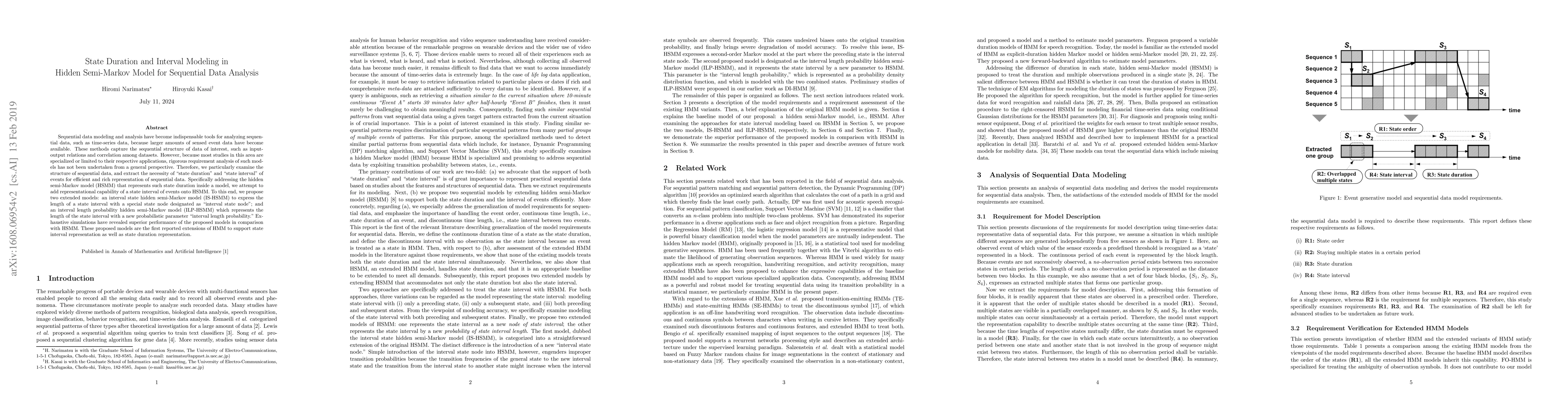 Sequential data modeling and analysis have become indispensable tools for analyzing sequential data, such as time-series data, because larger amounts of sensed event data have become available. These methods capture the sequential structure of data of interest, such as input-output relations and correlation among datasets. However, because most studies in this area are specialized or limited to their respective applications, rigorous requirement analysis of such models has not been undertaken from a general perspective. Therefore, we particularly examine the structure of sequential data, and extract the necessity of `state duration' and `state interval' of events for efficient and rich representation of sequential data. Specifically addressing the hidden semi-Markov model (HSMM) that represents such state duration inside a model, we attempt to add representational capability of a state interval of events onto HSMM. To this end, we propose two extended models: an interval state hidden semi-Markov model (IS-HSMM) to express the length of a state interval with a special state node designated as "interval state node"; and an interval length probability hidden semi-Markov model (ILP-HSMM) which represents the length of the state interval with a new probabilistic parameter "interval length probability." Exhaustive simulations have revealed superior performance of the proposed models in comparison with HSMM. These proposed models are the first reported extensions of HMM to support state interval representation as well as state duration representation.