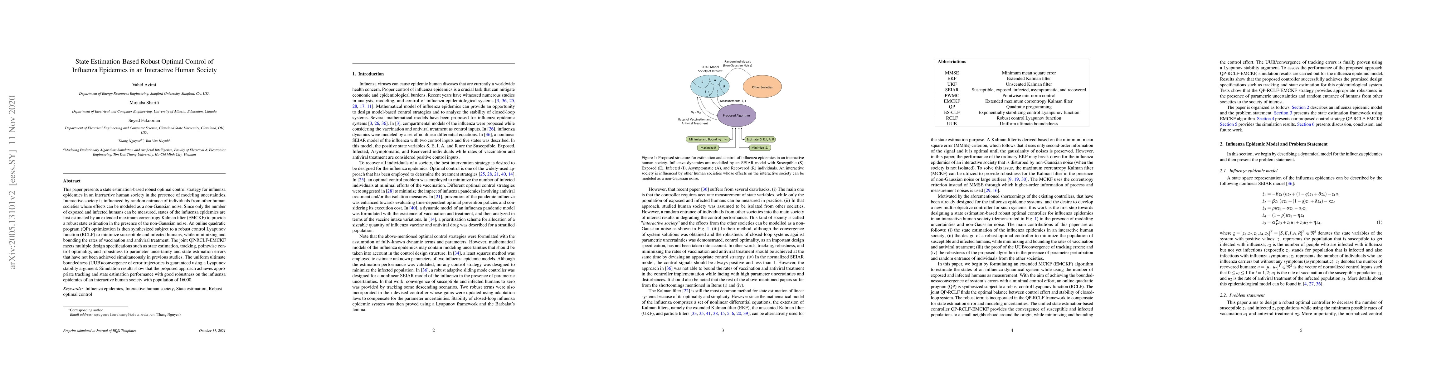 This paper presents a state estimation-based robust optimal control strategy for influenza epidemics in an interactive human society in the presence of modeling uncertainties. Interactive society is influenced by the random entrance of individuals from other human societies whose effects can be modeled as a non-Gaussian noise. Since only the number of exposed and infected humans can be measured, states of the influenza epidemics are first estimated by an extended maximum correntropy Kalman filter (EMCKF) to provide a robust state estimation in the presence of the non-Gaussian noise. An online quadratic program (QP) optimization is then synthesized subject to a robust control Lyapunov function (RCLF) to minimize susceptible and infected humans, while minimizing and bounding the rates of vaccination and antiviral treatment. The joint QP-RCLF-EMCKF meets multiple design specifications such as state estimation, tracking, pointwise control optimality, and robustness to parameter uncertainty and state estimation errors that have not been achieved simultaneously in previous studies. The uniform ultimate boundedness (UUB)/convergence of error trajectories is guaranteed using a Lyapunov stability argument. The soundness of the proposed approach is validated on the influenza epidemics of an interactive human society with a population of 16000. Simulation results show that the QP-RCLF-EMCKF achieves appropriate tracking and state estimation performance. The robustness of the proposed controller is finally illustrated in the presence of modeling error and non-Gaussian noise.