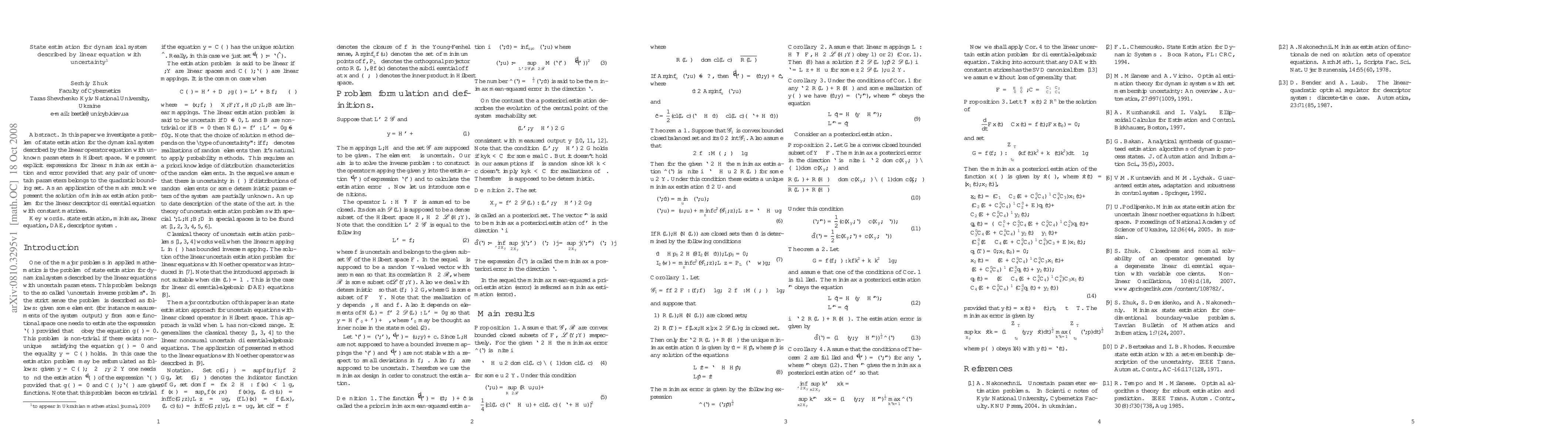 In this paper we investigate a problem of state estimation for the dynamical system described by the linear operator equation with unknown parameters in Hilbert space. We present explicit expressions for linear minimax estimation and error provided that any pair of uncertain parameters belongs to the quadratic bounding set. As an application of the main result we present the solution of minimax estimation problem for the linear descriptor differential equation with constant matrices.