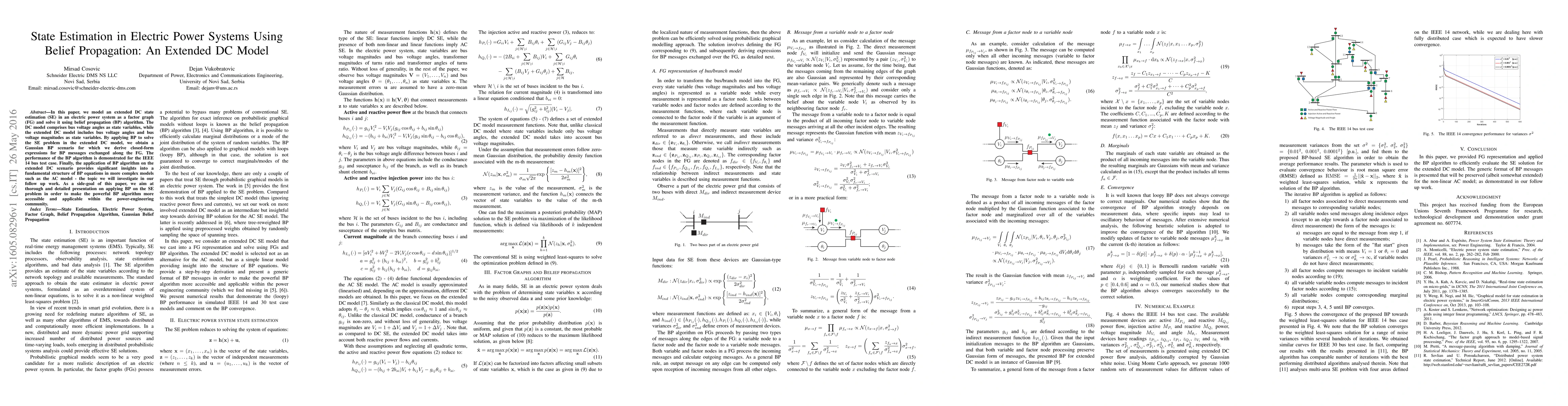 This paper proposes using belief propagation (BP) on an extended DC model for state estimation in electric power systems, deriving closed-form expressions for BP messages. The method is demonstrated on the IEEE 14 bus test case, providing insights into BP's application in more complex AC models.