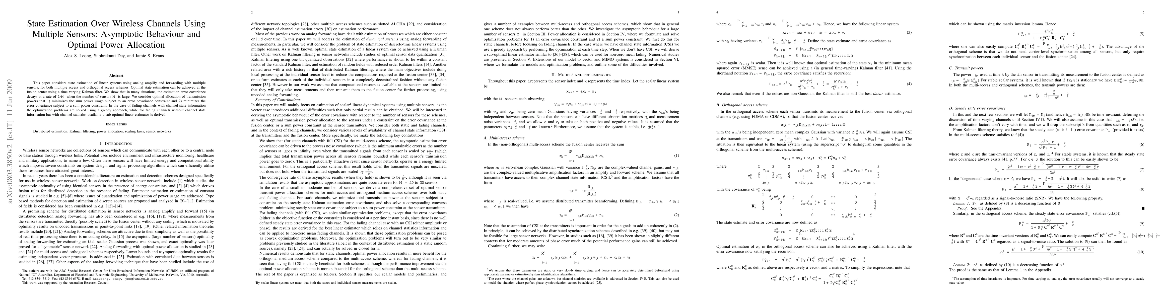 This paper investigates state estimation in linear systems using multiple sensors over wireless channels, focusing on optimal power allocation strategies. It demonstrates that estimation error covariance decreases as $1/M$ with a large number of sensors, and proposes optimal power allocation methods for minimizing power usage and error covariance.