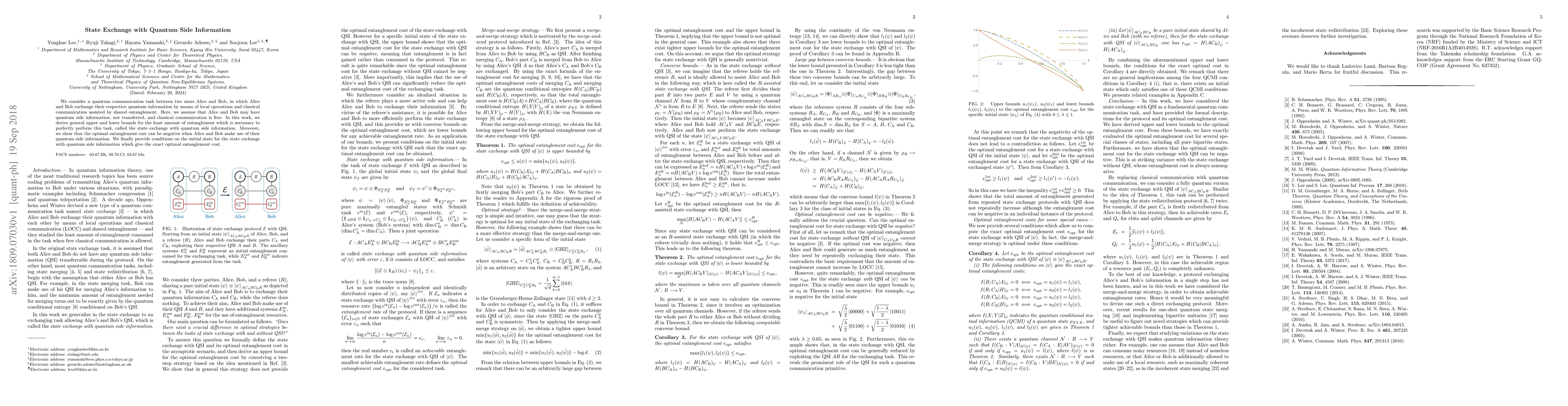 We consider a quantum communication task between two users Alice and Bob, in which Alice and Bob exchange their respective quantum information by means of local operations and classical communication assisted by shared entanglement. Here, we assume that Alice and Bob may have quantum side information, not transferred, and classical communication is free. In this work, we derive general upper and lower bounds for the least amount of entanglement which is necessary to perfectly perform this task, called the state exchange with quantum side information. Moreover, we show that the optimal entanglement cost can be negative when Alice and Bob make use of their quantum side information. We finally provide conditions on the initial state for the state exchange with quantum side information which give the exact optimal entanglement cost.