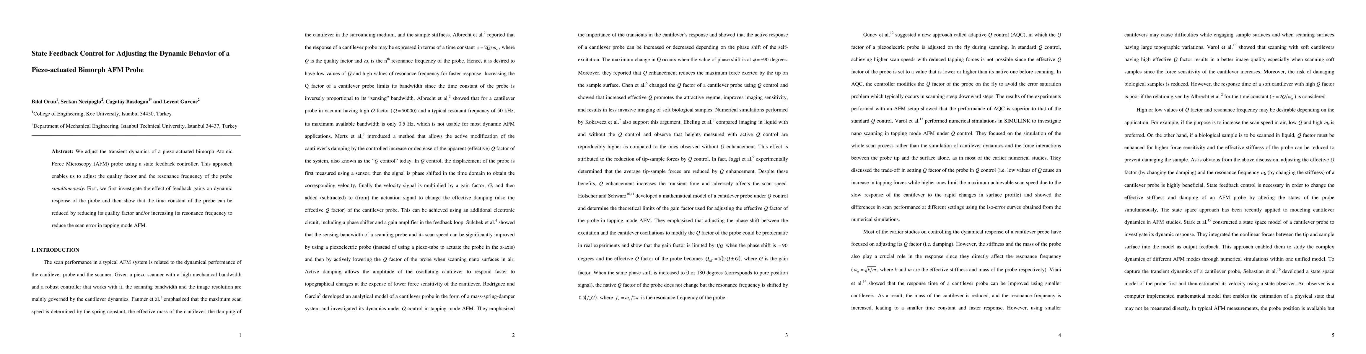 We adjust the transient dynamics of a piezo-actuated bimorph Atomic Force Microscopy (AFM) probe using a state feedback controller. This approach enables us to adjust the quality factor and the resonance frequency of the probe simultaneously. First, we first investigate the effect of feedback gains on dynamic response of the probe and then show that the time constant of the probe can be reduced by reducing its quality factor and/or increasing its resonance frequency to reduce the scan error in tapping mode AFM.