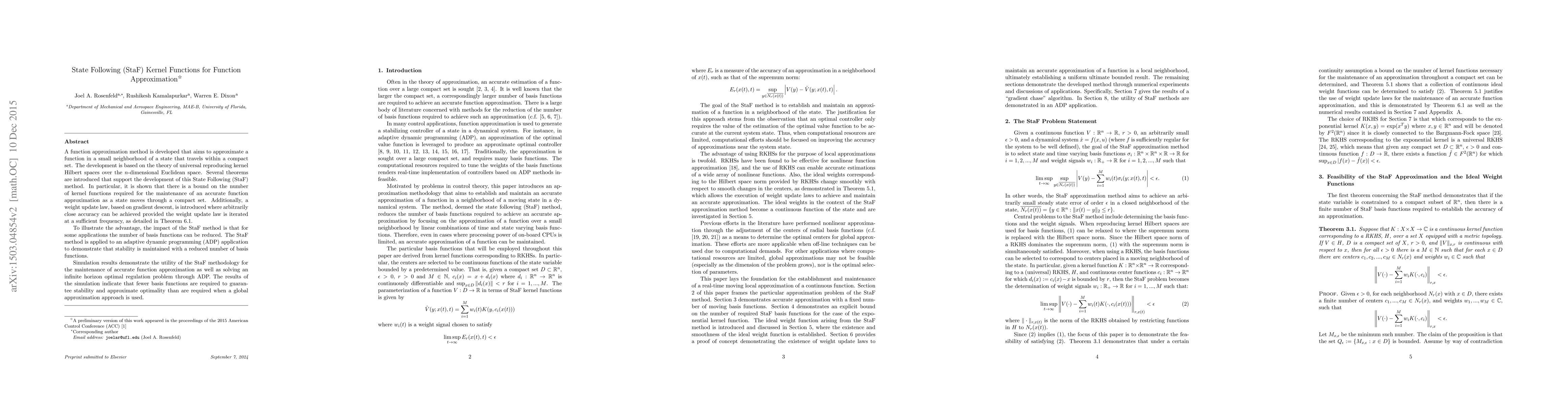 A function approximation method is developed that aims to approximate a function in a small neighborhood of a state that travels within a compact set. The development is based on the theory of universal reproducing kernel Hilbert spaces over the $n$-dimensional Euclidean space. Several theorems are introduced that support the development of this State Following (StaF) method. In particular, it is shown that there is a bound on the number of kernel functions required for the maintenance of an accurate function approximation as a state moves through a compact set. Additionally, a weight update law, based on gradient descent, is introduced where arbitrarily close accuracy can be achieved provided the weight update law is iterated at a sufficient frequency, as detailed in Theorem 6.1. To illustrate the advantage, the impact of the StaF method is that for some applications the number of basis functions can be reduced. The StaF method is applied to an adaptive dynamic programming (ADP) application to demonstrate that stability is maintained with a reduced number of basis functions. Simulation results demonstrate the utility of the StaF methodology for the maintenance of accurate function approximation as well as solving an infinite horizon optimal regulation problem through ADP. The results of the simulation indicate that fewer basis functions are required to guarantee stability and approximate optimality than are required when a global approximation approach is used.