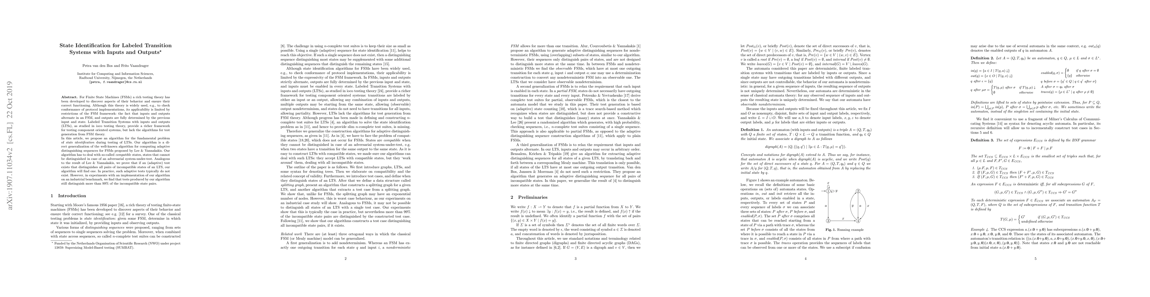 For Finite State Machines (FSMs) a rich testing theory has been developed to discover aspects of their behavior and ensure their correct functioning. Although this theory is widely used, e.g., to check conformance of protocol implementations, its applicability is limited by restrictions of the FSM framework: the fact that inputs and outputs alternate in an FSM, and outputs are fully determined by the previous input and state. Labeled Transition Systems with inputs and outputs (LTSs), as studied in ioco testing theory, provide a richer framework for testing component oriented systems, but lack the algorithms for test generation from FSM theory. In this article, we propose an algorithm for the fundamental problem of state identification during testing of LTSs. Our algorithm is a direct generalization of the well-known algorithm for computing adaptive distinguishing sequences for FSMs proposed by Lee & Yannakakis. Our algorithm has to deal with so-called compatible states, states that cannot be distinguished in case of an adversarial system-under-test. Analogous to the result of Lee & Yannakakis, we prove that if an (adaptive) test exists that distinguishes all pairs of incompatible states of an LTS, our algorithm will find one. In practice, such adaptive tests typically do not exist. However, in experiments with an implementation of our algorithm on an industrial benchmark, we find that tests produced by our algorithm still distinguish more than 99% of the incompatible state pairs.