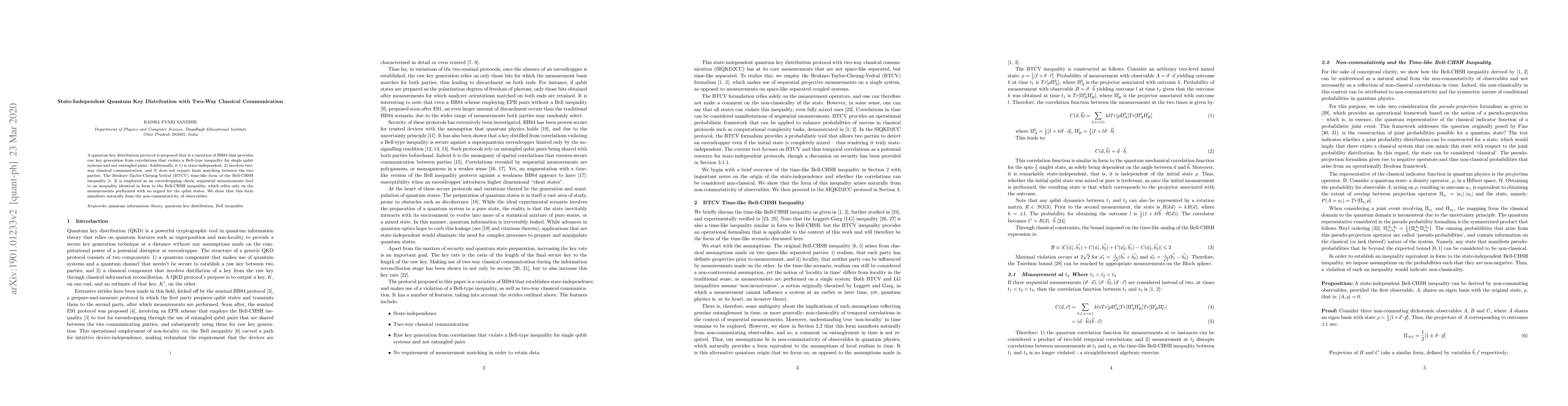 This paper proposes a state-independent quantum key distribution protocol based on BB84 that generates raw keys from single qubit correlations violating a Bell-type inequality, utilizing two-way classical communication without basis matching. The protocol employs the BTCV form of the Bell-CHSH inequality for eavesdropping checks, which is inherently state-independent.